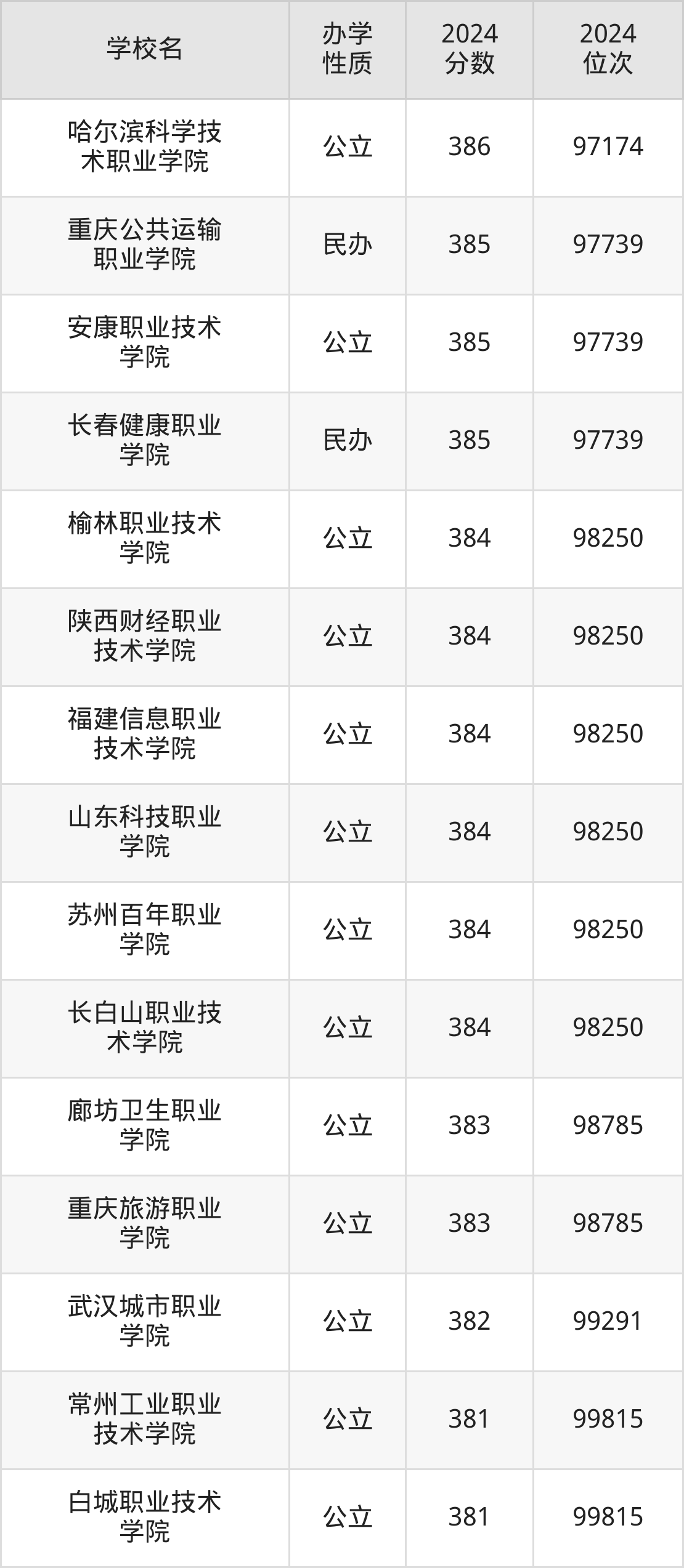 | 甘肃卫生职业 学院 | 385 | 126981 |