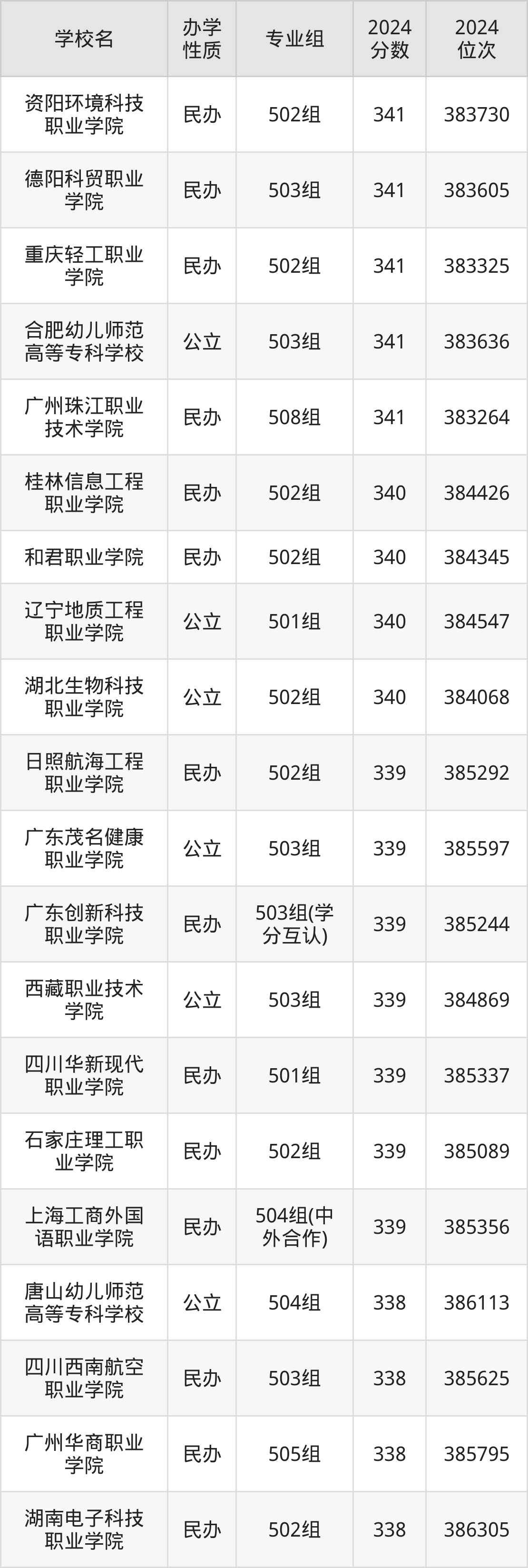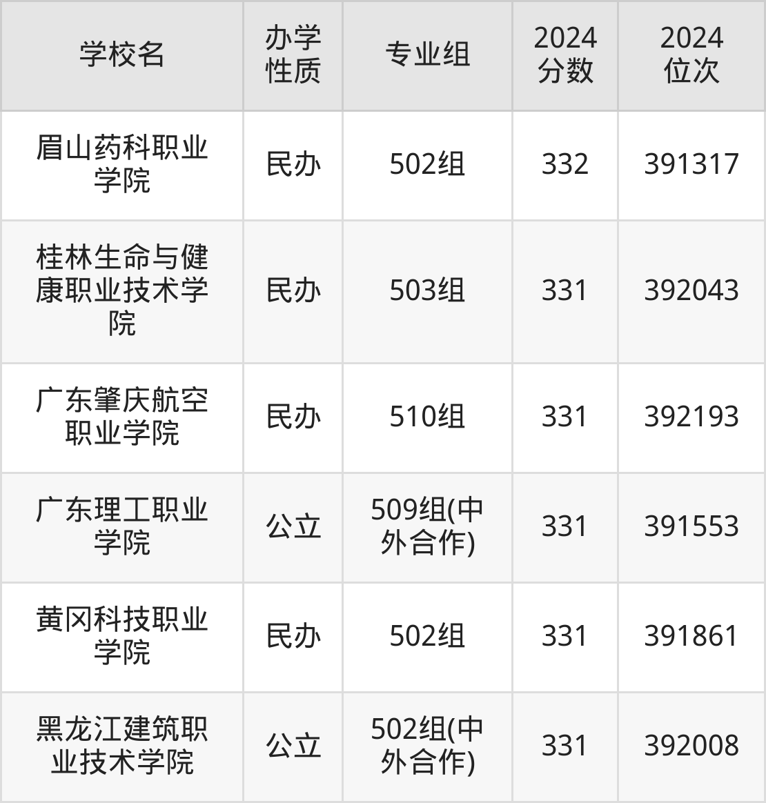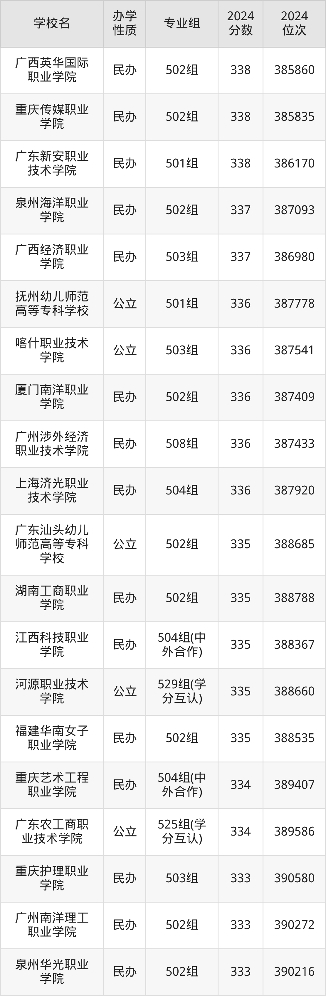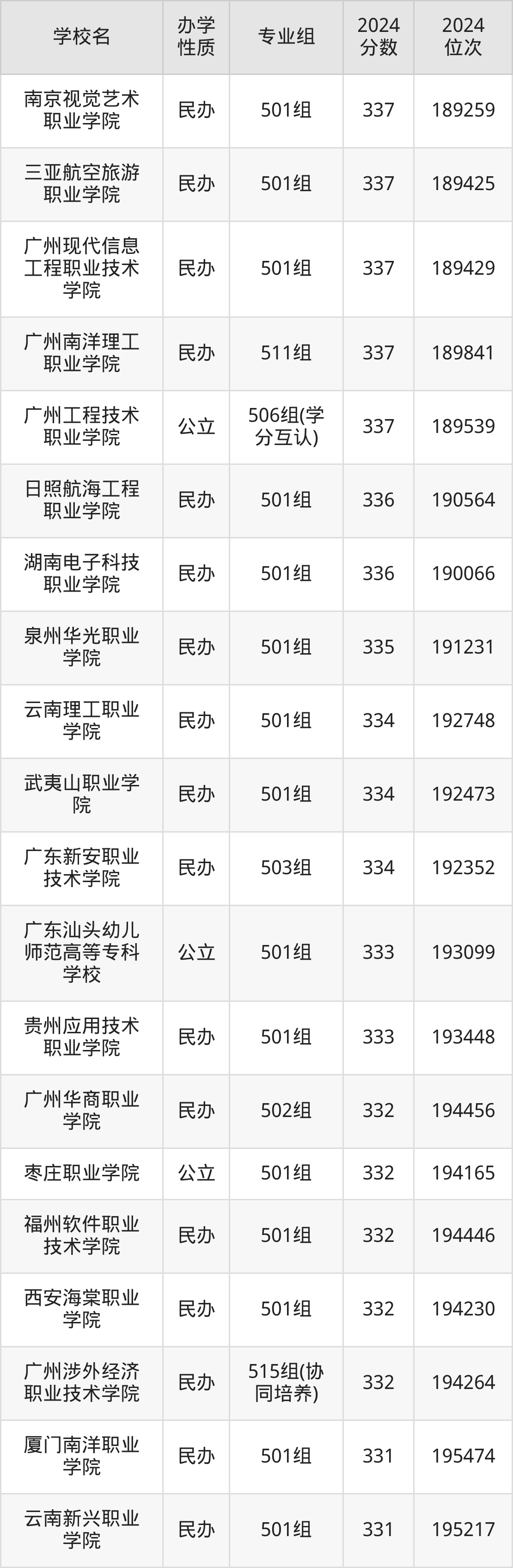 2024年广东物理类336分考生能上资阳环境科技职业学院、德阳科贸职业学院、重庆轻工职业学院、合肥幼儿师范高等专科学校、广州珠江职业技术学院等46所专科院校,具体录取分数线及位次为: