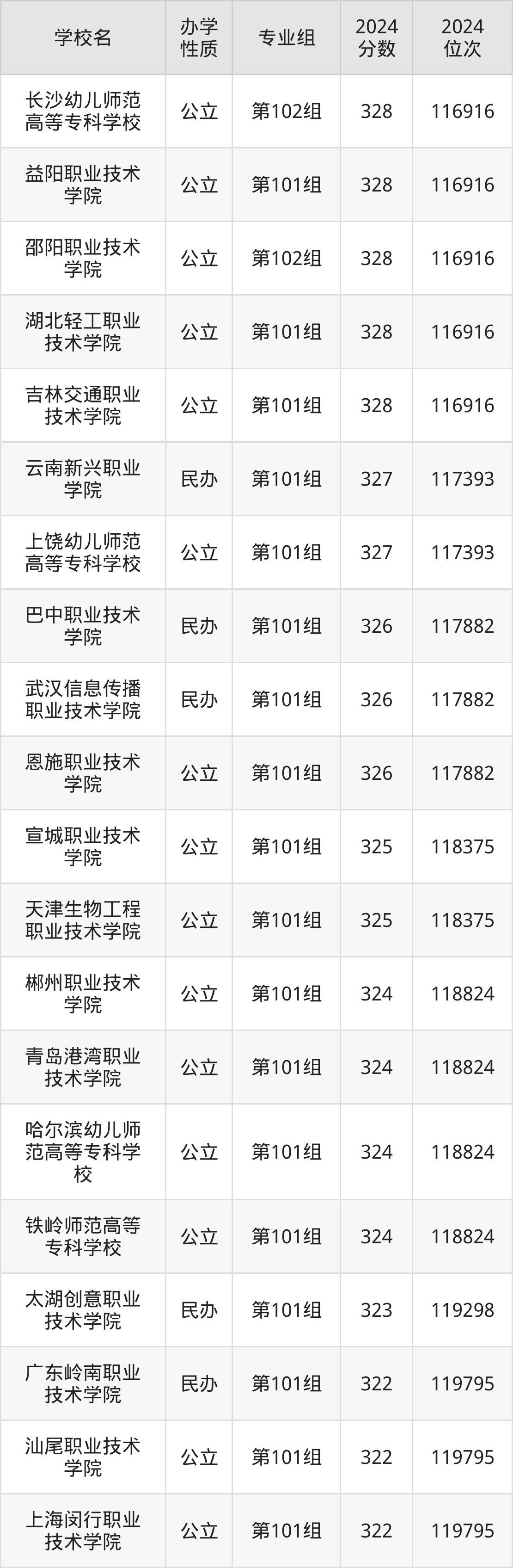 | 长沙幼儿师范 高等专科学校 | 第102组 | 328 | 116916 |
