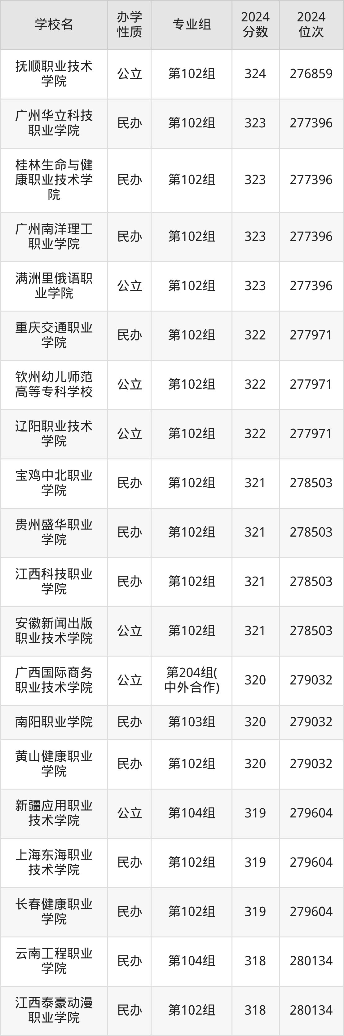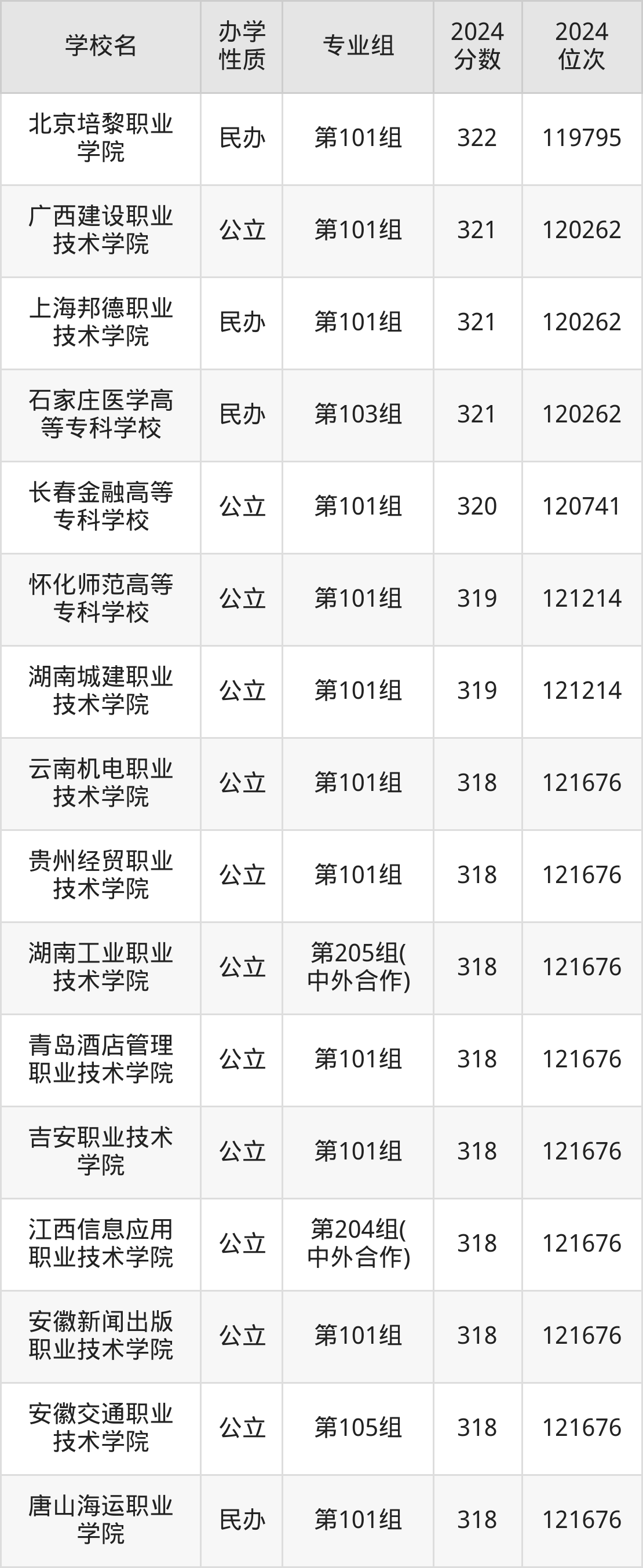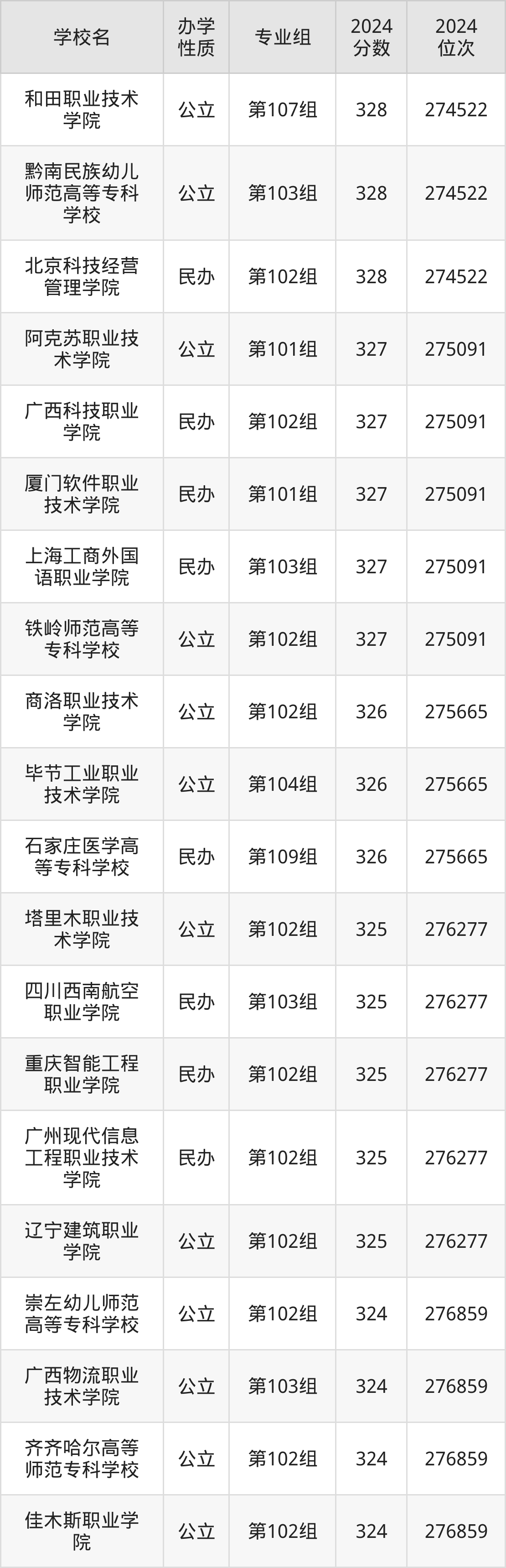 2024年湖南物理类323分考生能上和田职业技术学院、黔南民族幼儿师范高等专科学校、北京科技经营管理学院、阿克苏职业技术学院、广西科技职业学院等40所专科院校,具体录取分数线及位次为: