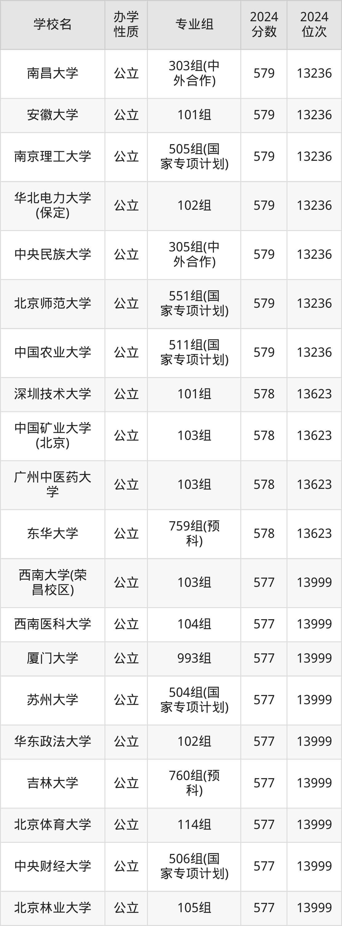 | 中央民族大学 | 305组(中 外合作) | 579 | 13236 |