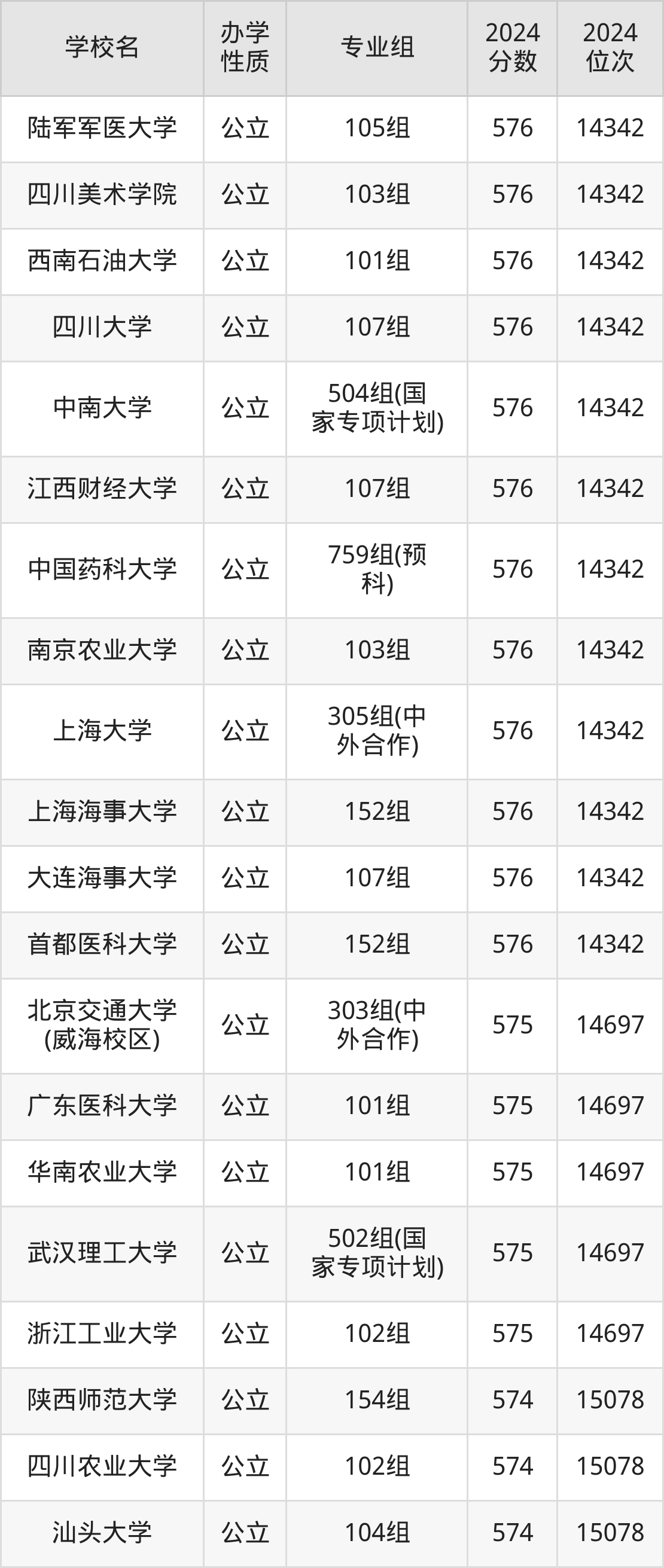 | 中国药科大学 | 759组(预 科) | 576 | 14342 |