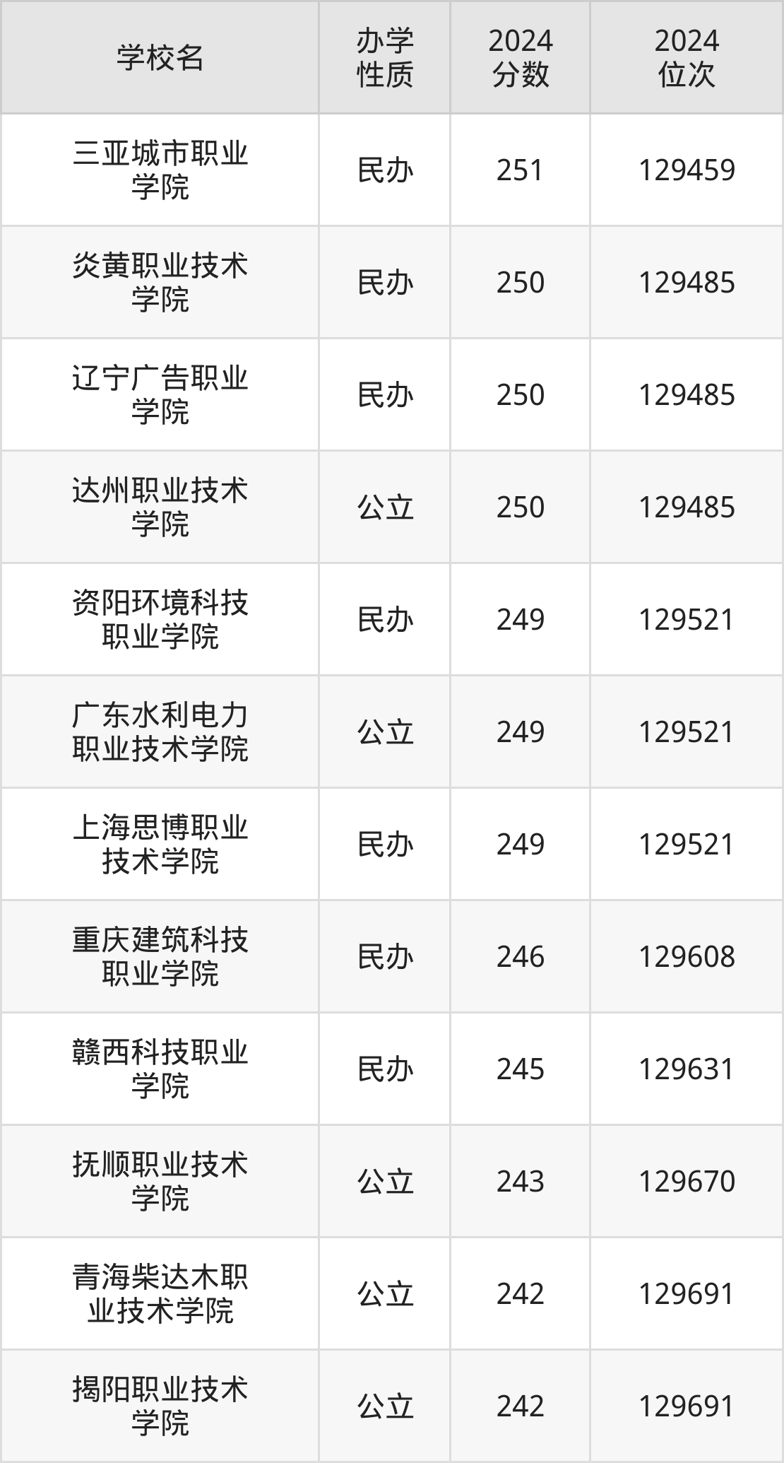 | 资阳环境科技 职业学院 | 249 | 129521 |