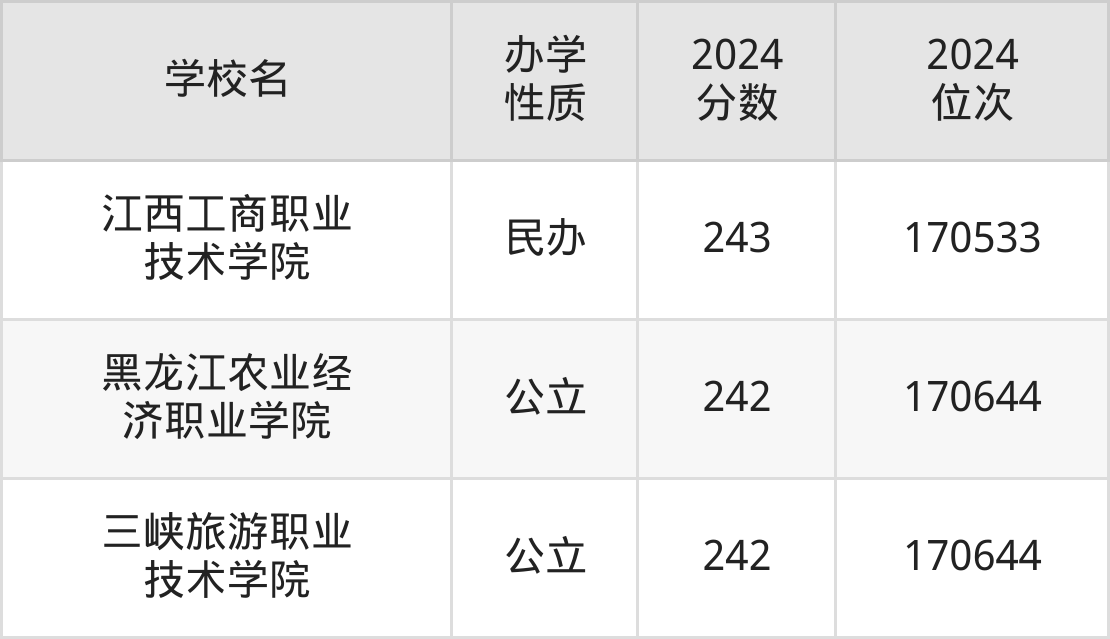 | 三峡旅游职业 技术学院 | 242 | 170644 |
