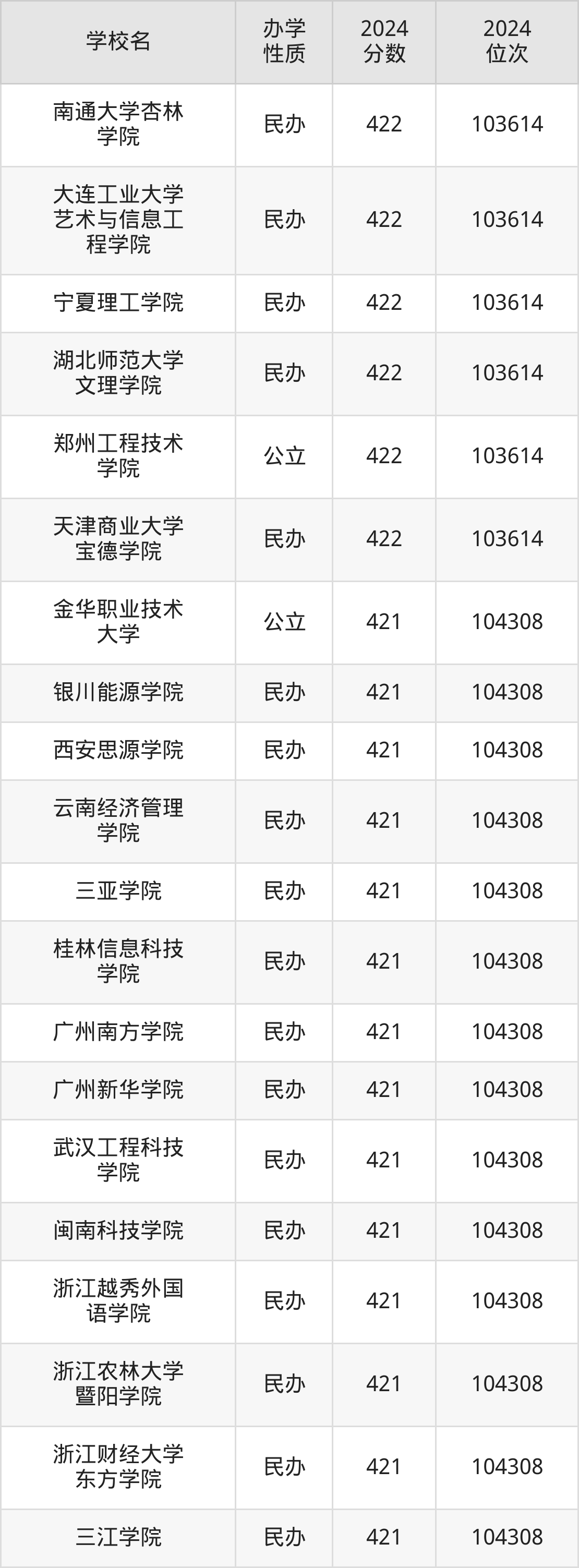 | 浙江财经大学 东方学院 | 421 | 104308 |
