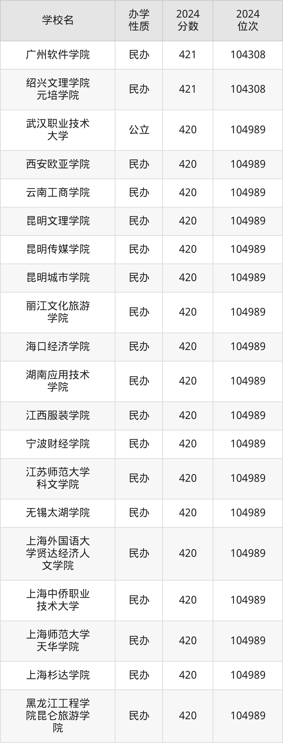 | 上海师范大学 天华学院 | 420 | 104989 |