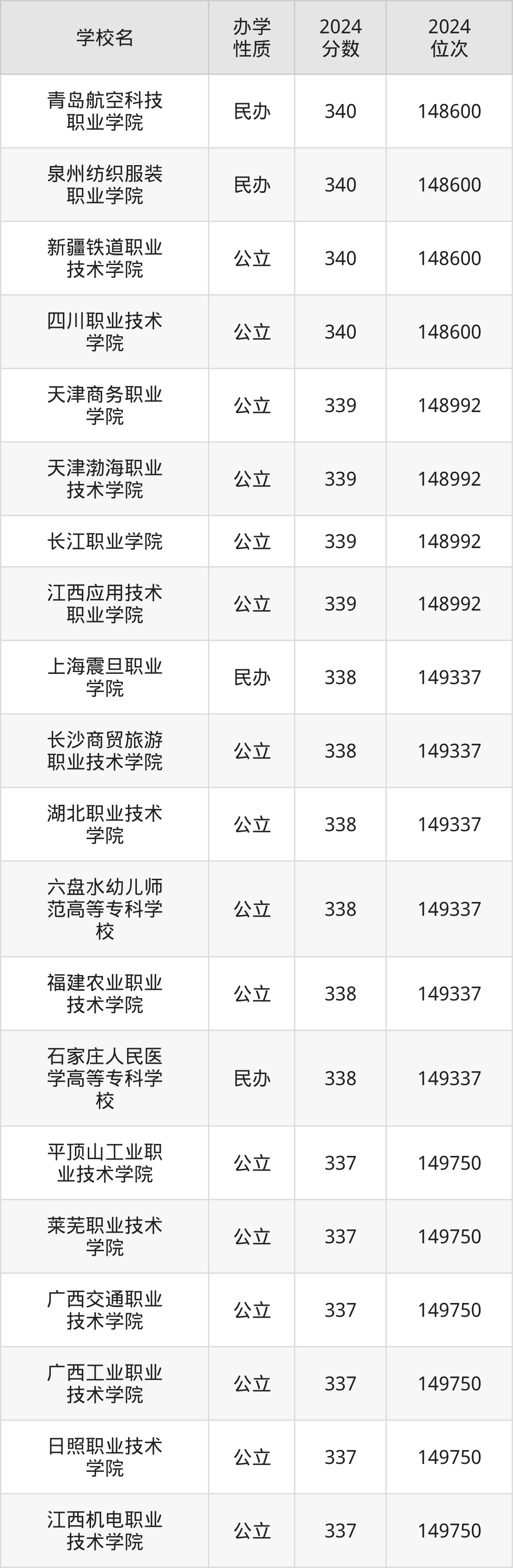 2024年云南理科335分考生能上青岛航空科技职业学院、泉州纺织服装职业学院、新疆铁道职业技术学院、四川职业技术学院、天津商务职业学院等42所专科院校,具体录取分数线及位次为: