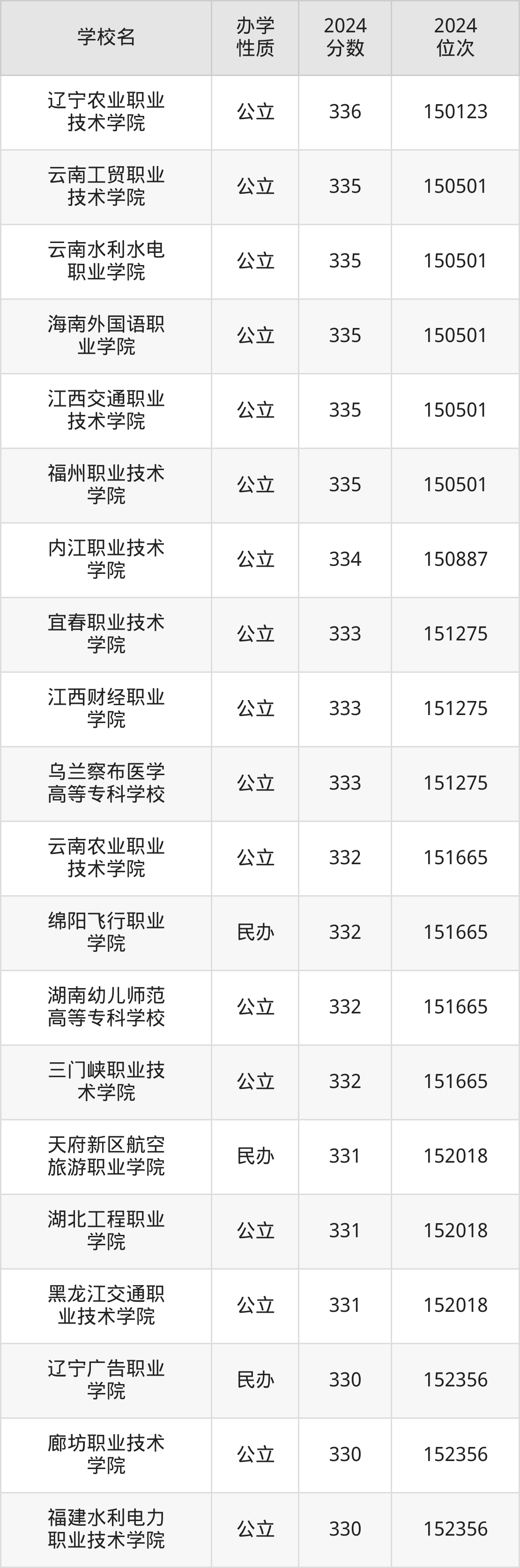 | 福建水利电力 职业技术学院 | 330 | 152356 |