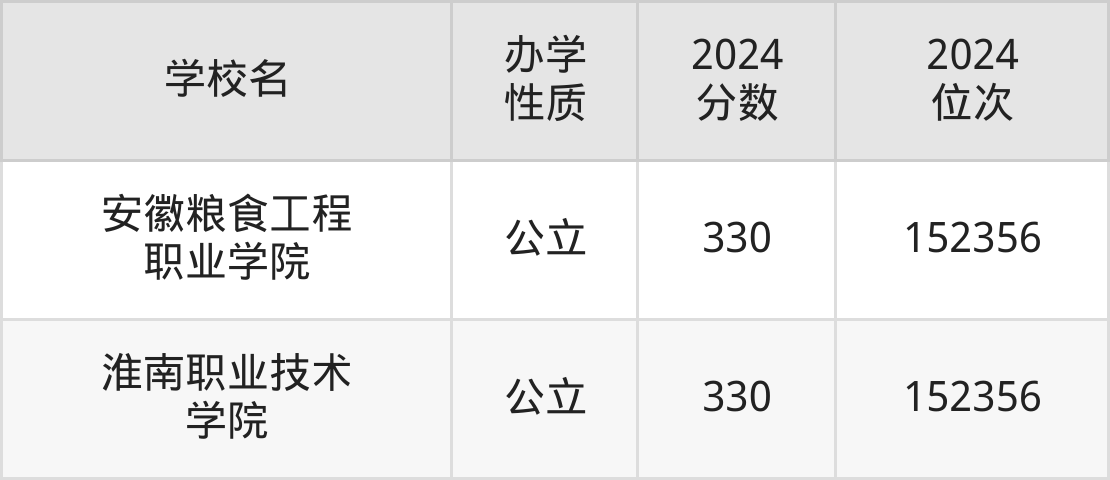 | 安徽粮食工程 职业学院 | 330 | 152356 |