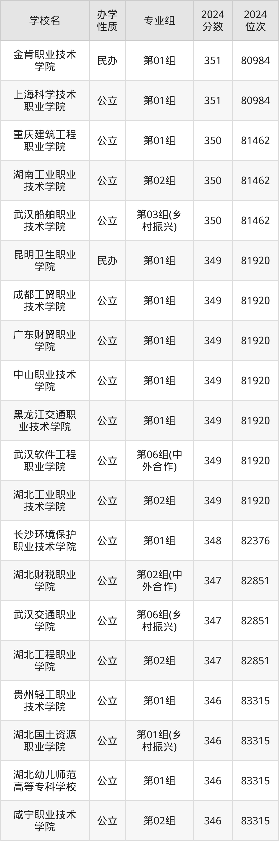 2024年湖北历史类346分考生能上金肯职业技术学院、上海科学技术职业学院、重庆建筑工程职业学院、湖南工业职业技术学院、武汉船舶职业技术学院等42所专科院校,具体录取分数线及位次为: