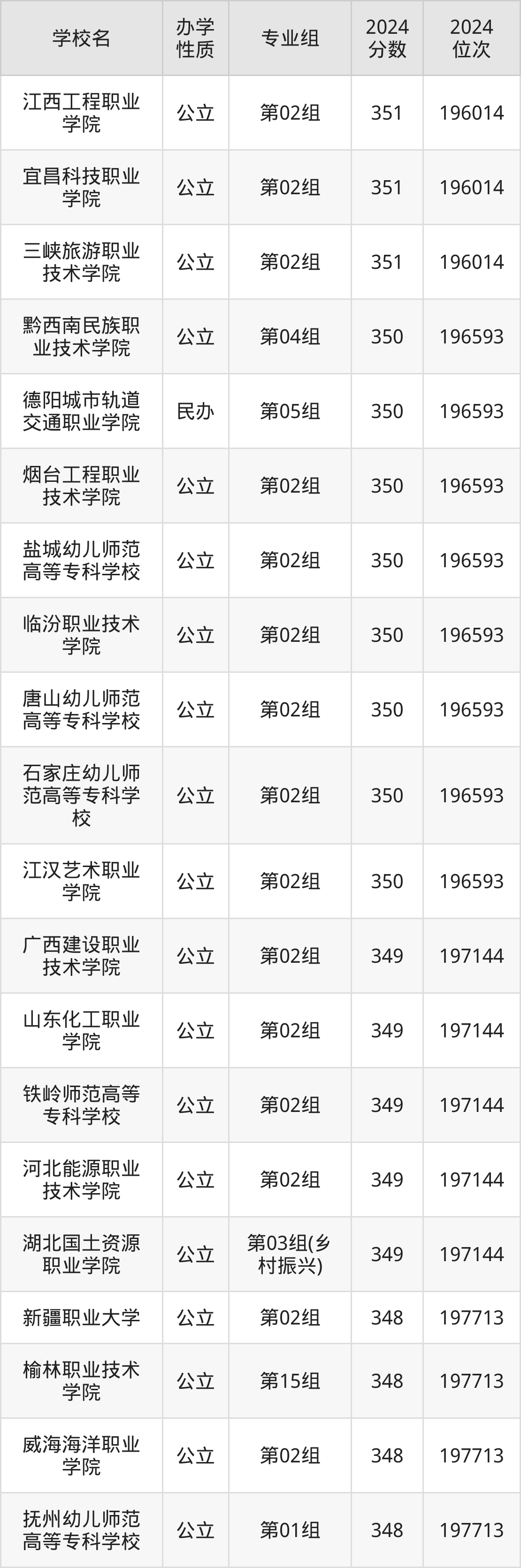 2024年湖北物理类346分考生能上江西工程职业学院、宜昌科技职业学院、三峡旅游职业技术学院、黔西南民族职业技术学院、德阳城市轨道交通职业学院等59所专科院校,具体录取分数线及位次为: