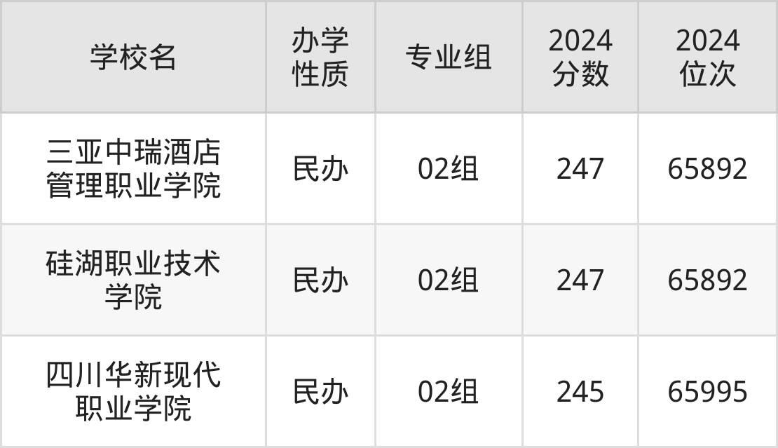 2024年江苏物理类250分考生能上三亚中瑞酒店管理职业学院、硅湖职业技术学院、四川华新现代职业学院3所专科院校,具体录取分数线及位次为: