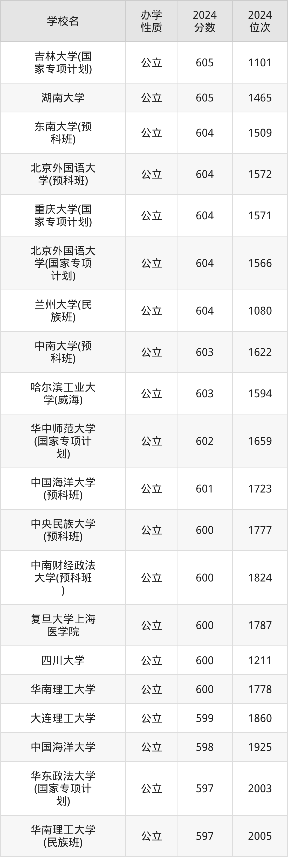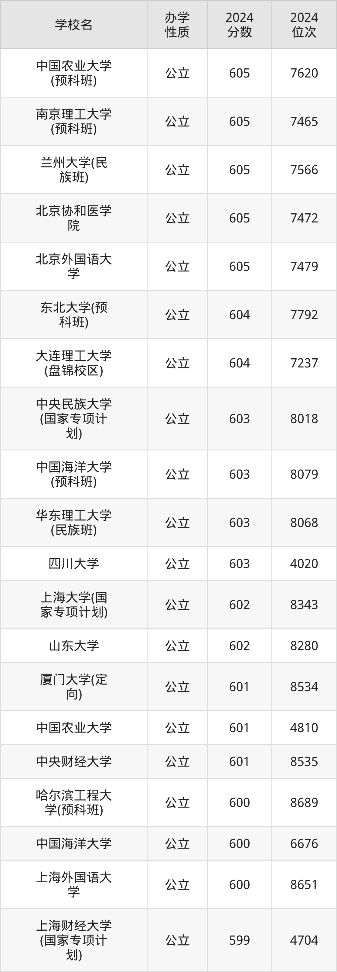 2024年贵州物理类600分考生能上大连理工大学(盘锦校区)、四川大学、山东大学、中国农业大学、中国海洋大学等6所985院校,具体录取分数线及位次为: