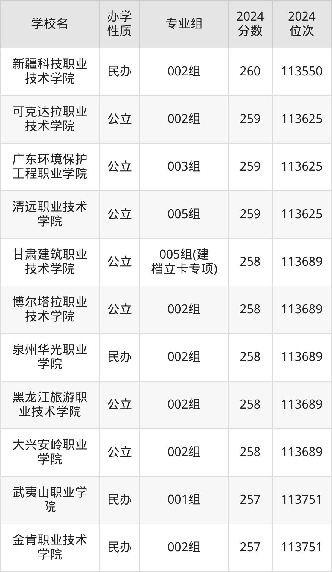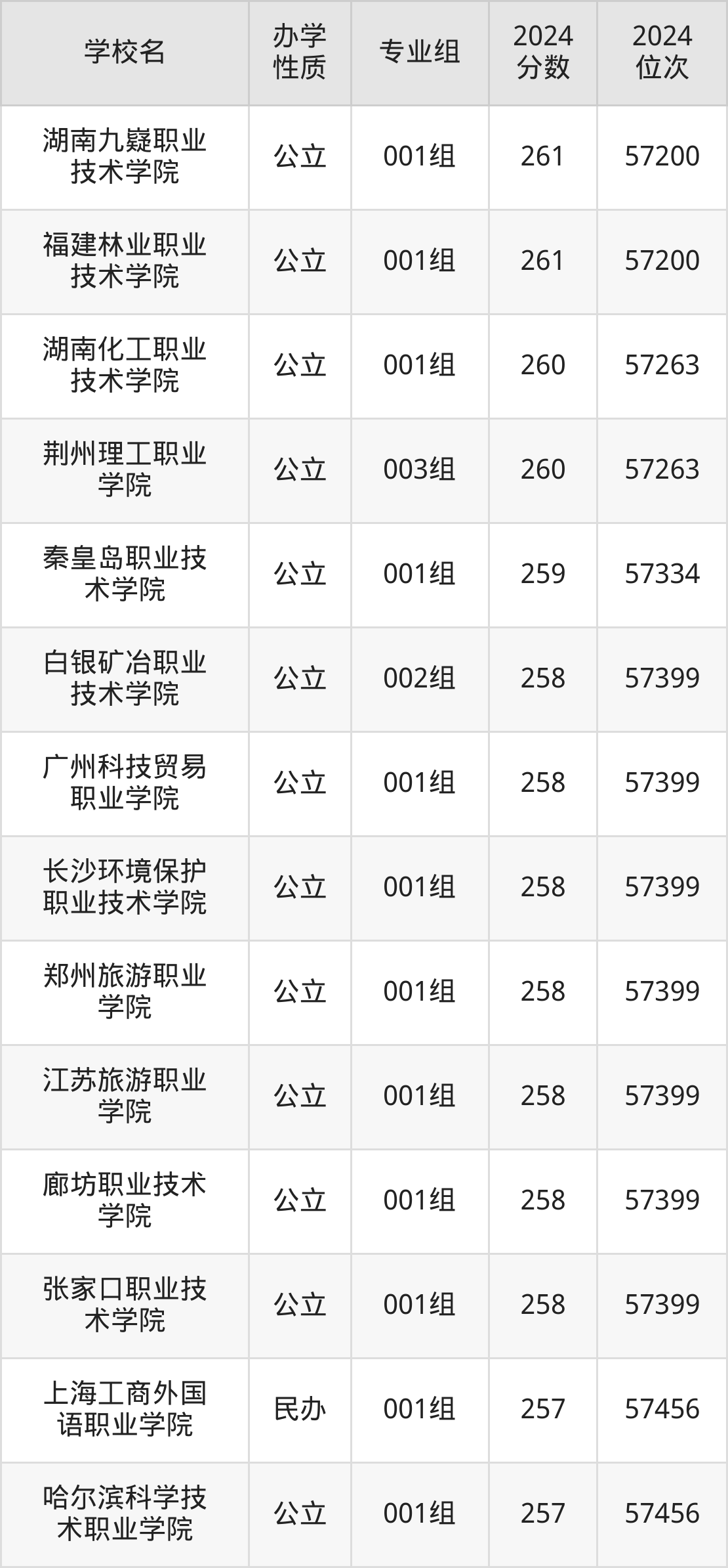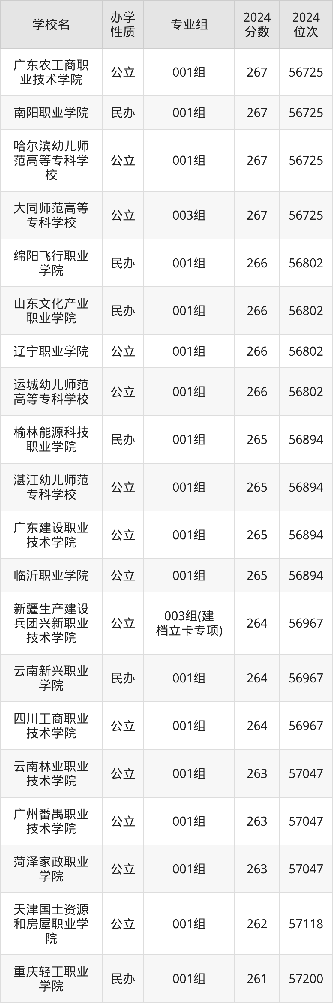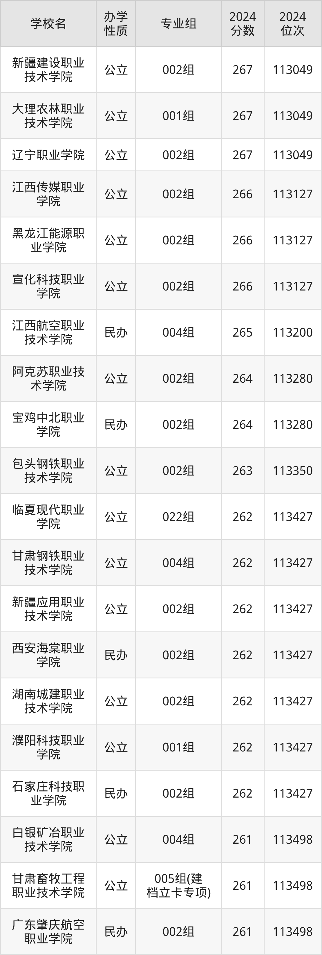 2024年甘肃物理类262分考生能上新疆建设职业技术学院、大理农林职业技术学院、辽宁职业学院、江西传媒职业学院、黑龙江能源职业学院等31所专科院校,具体录取分数线及位次为: