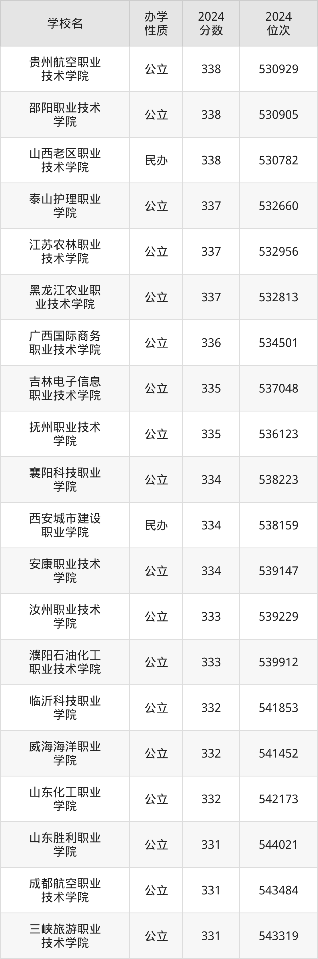 2024年山东333分考生能上贵州航空职业技术学院、邵阳职业技术学院、山西老区职业技术学院、泰山护理职业学院、江苏农林职业技术学院等27所专科院校,具体录取分数线及位次为: