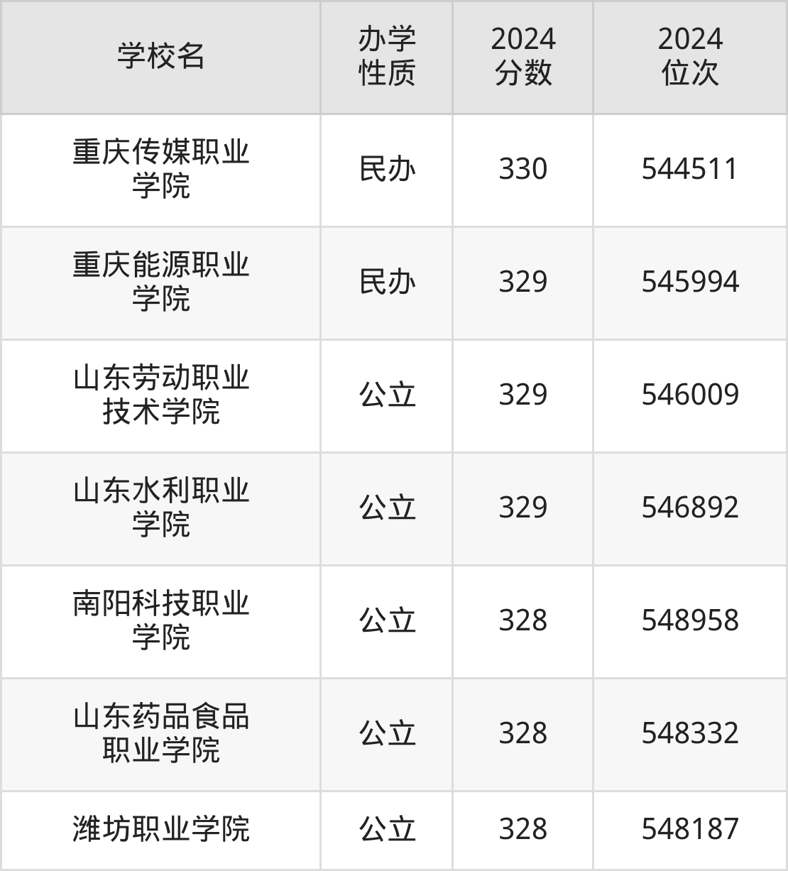 | 山东药品食品 职业学院 | 328 | 548332 |
