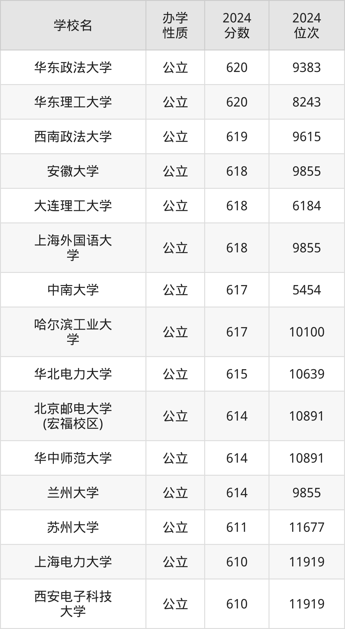 辽宁615分左右的考生可以上华东政法大学、华东理工大学、西南政法大学等院校,刚好在615分的院校有华北电力大学。