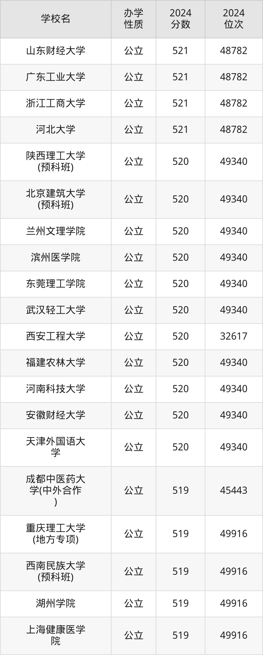 | 陕西理工大学 (预科班) | 520 | 49340 |
