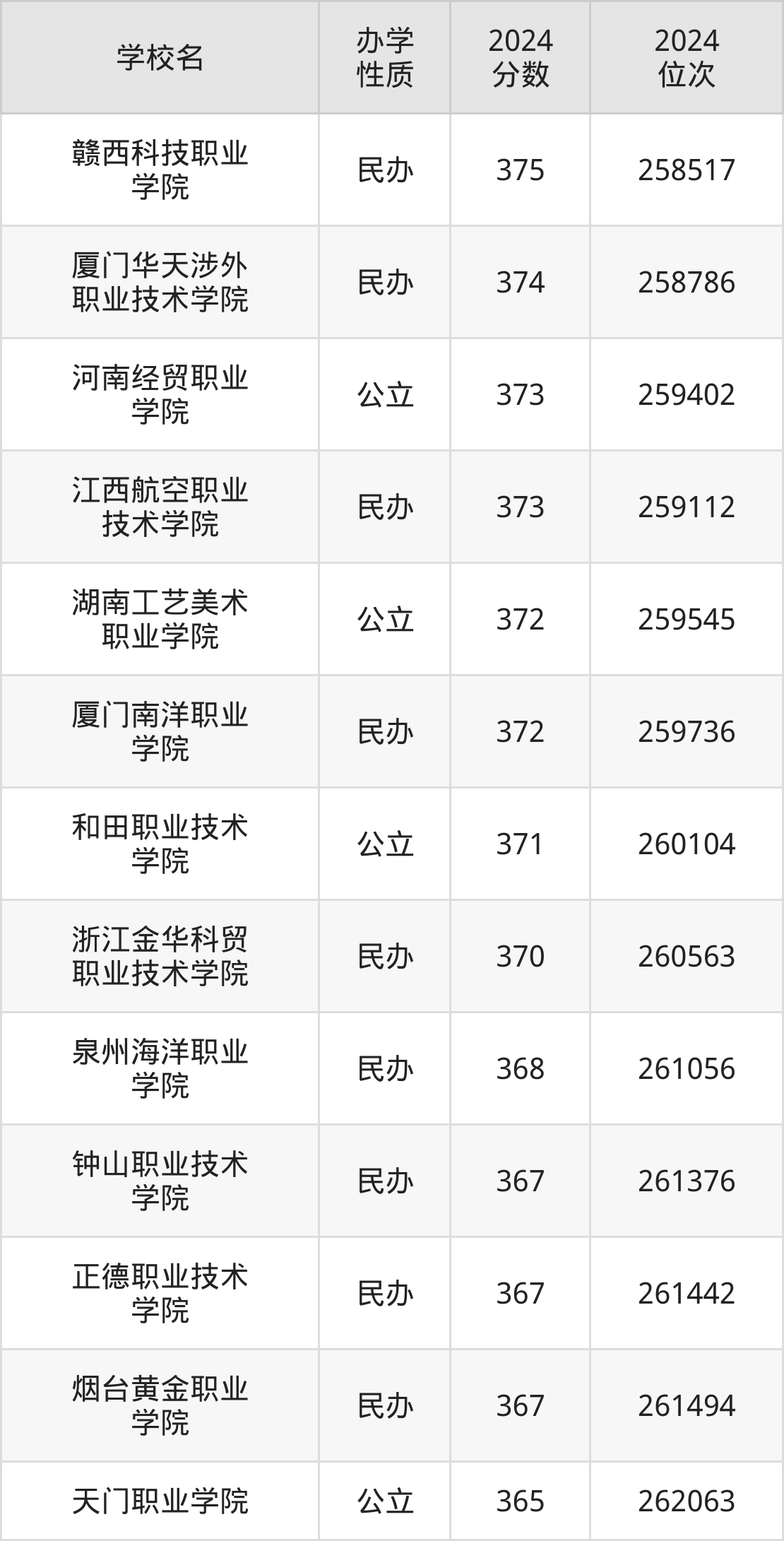 2024年浙江370分考生能上赣西科技职业学院、厦门华天涉外职业技术学院、河南经贸职业学院、江西航空职业技术学院、湖南工艺美术职业学院等13所专科院校,具体录取分数线及位次为: