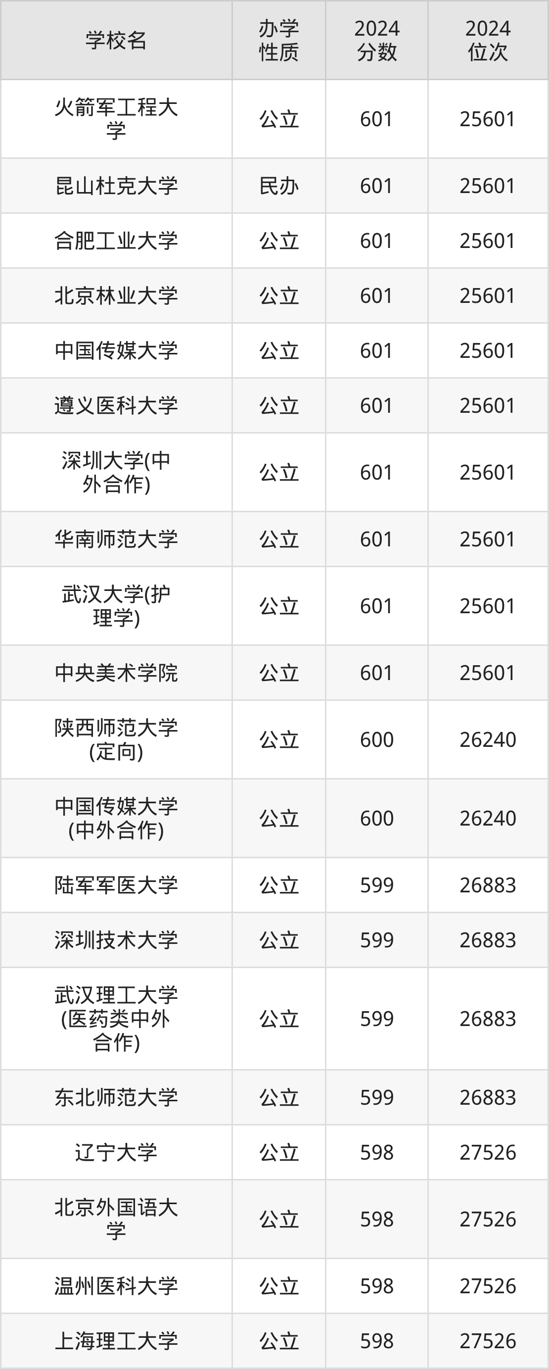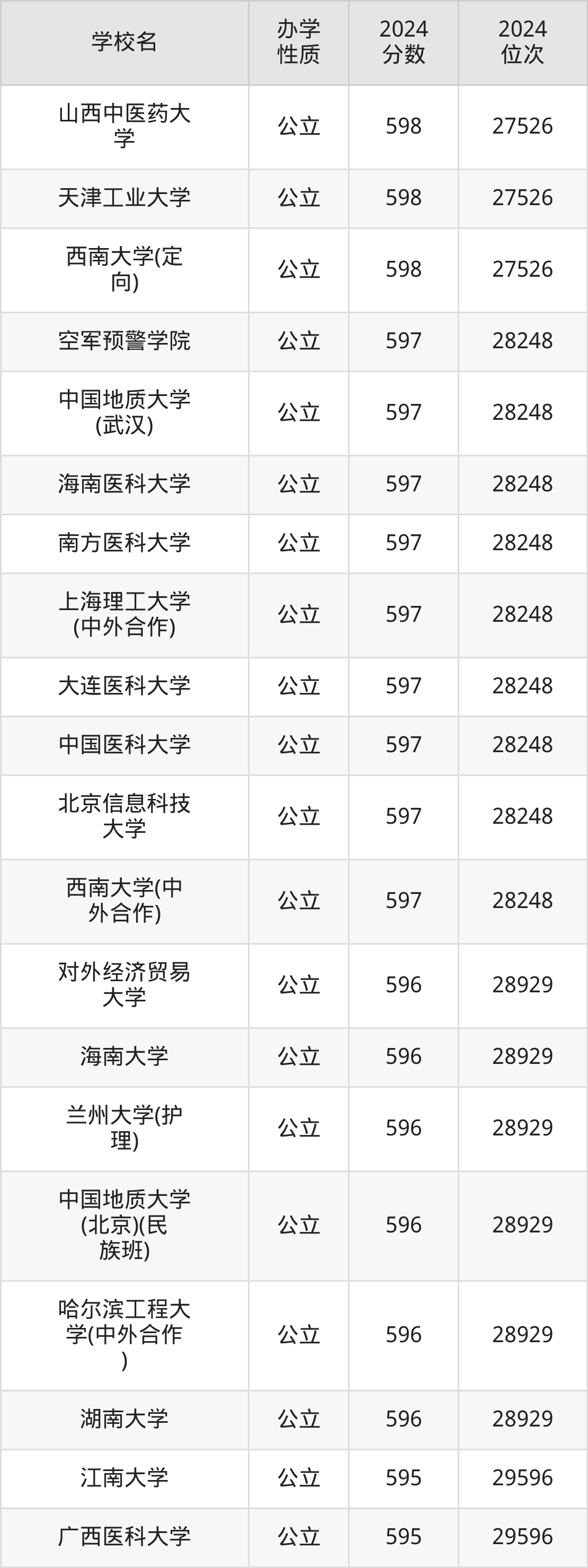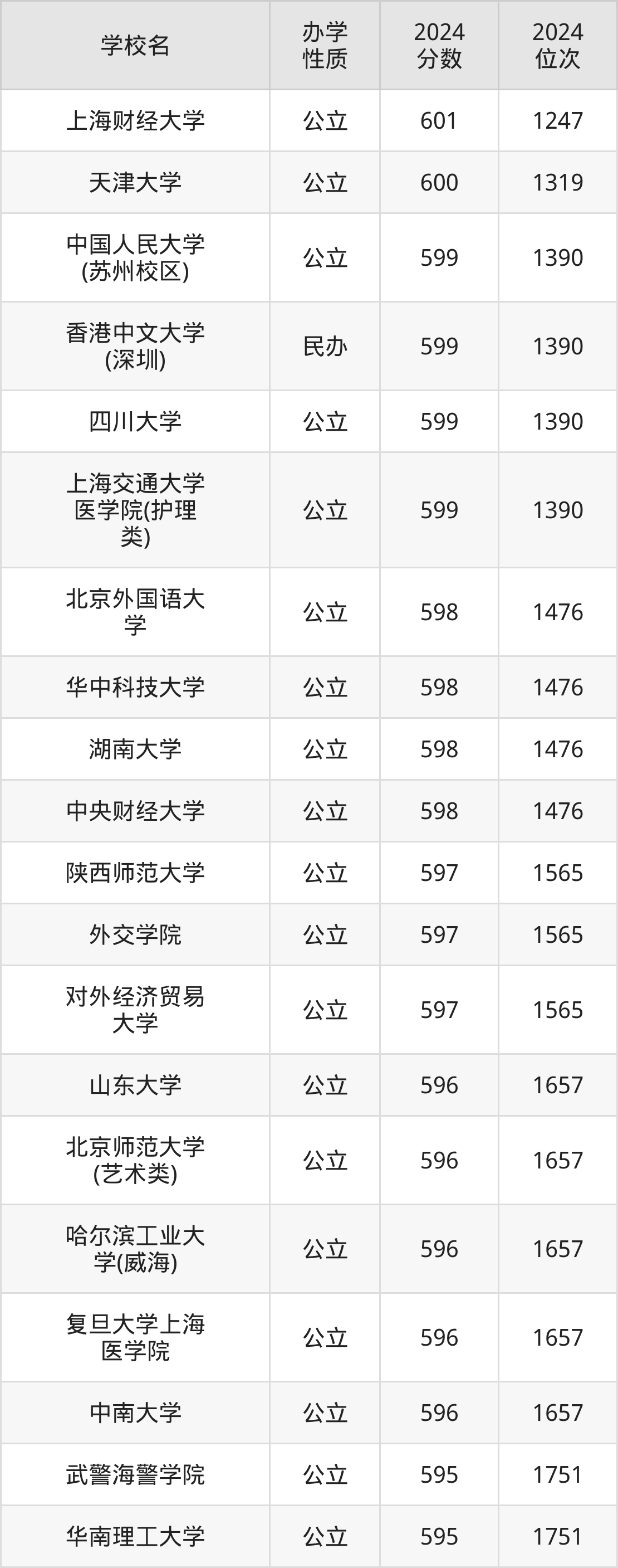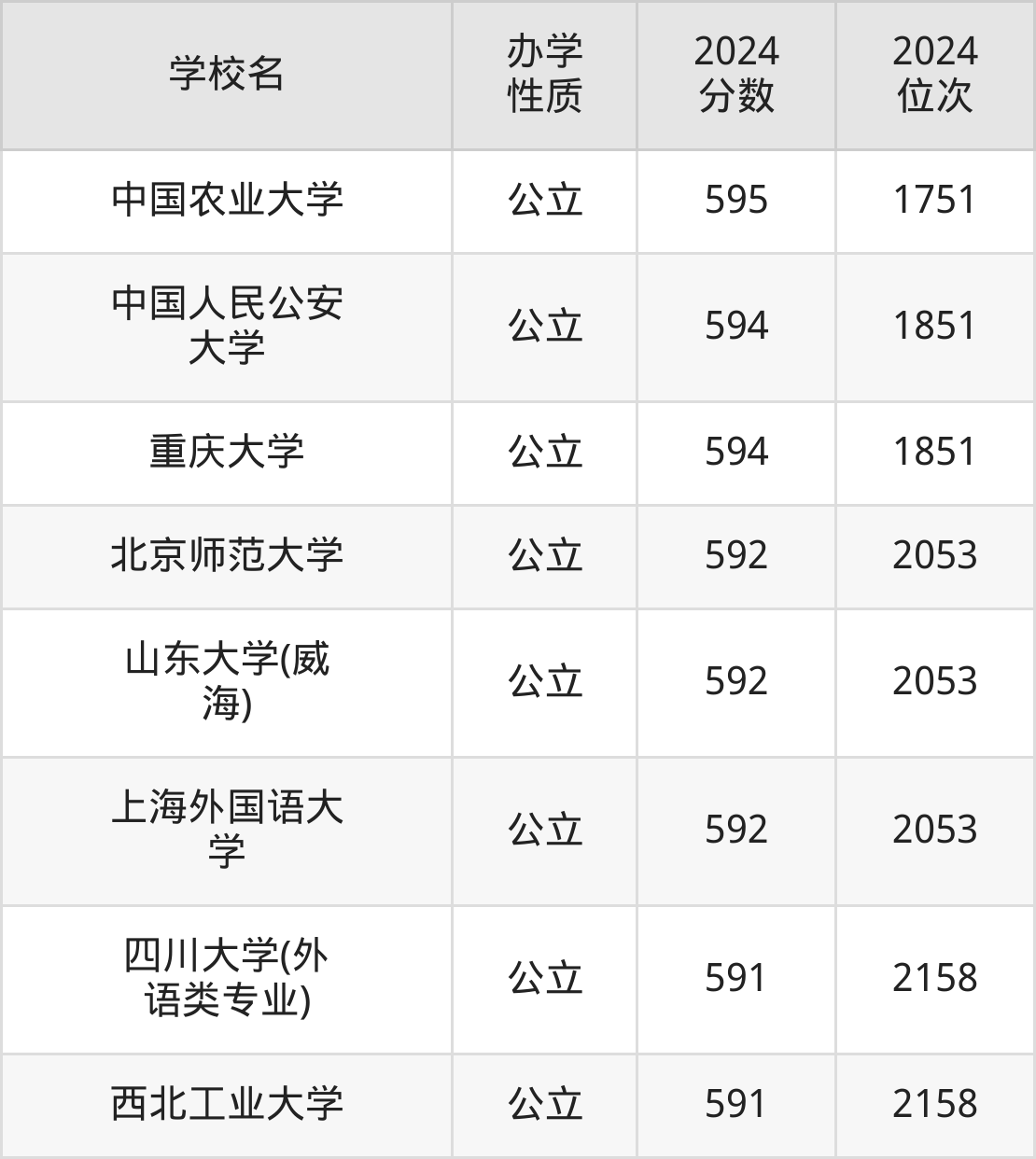 2024年四川文科596分考生能上湖南大学、西北工业大学、北京师范大学、山东大学(威海)、山东大学等15所985院校,具体录取分数线及位次为: