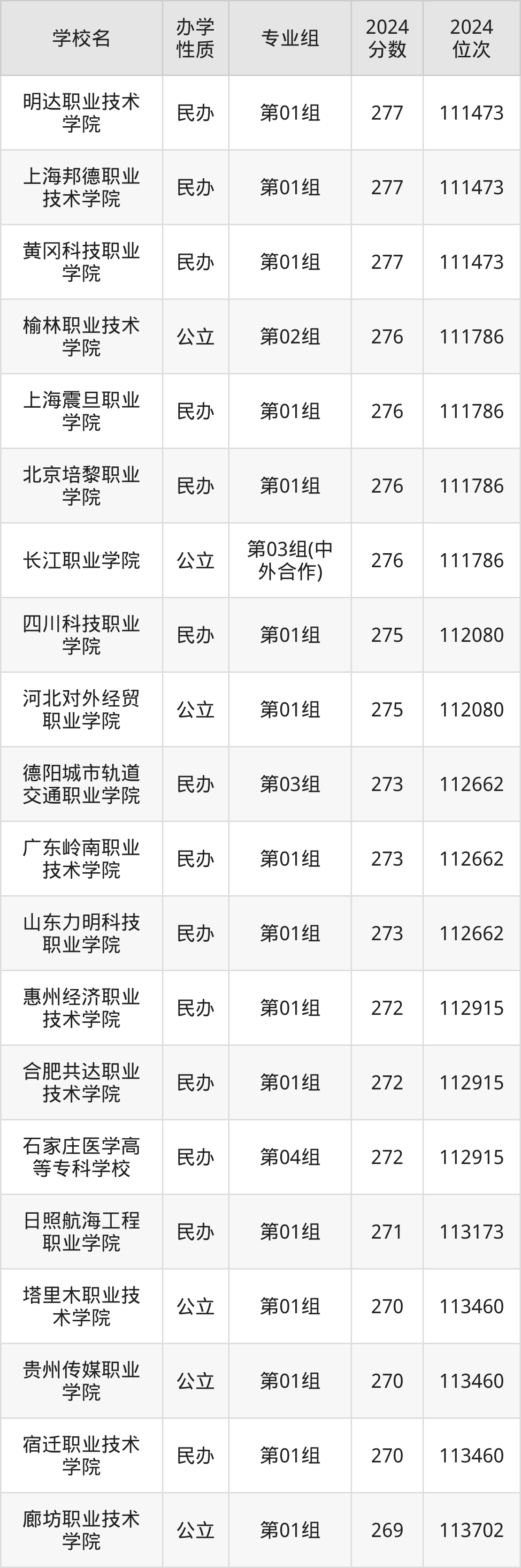 | 明达职业技术 学院 | 第01组 | 277 | 111473 |