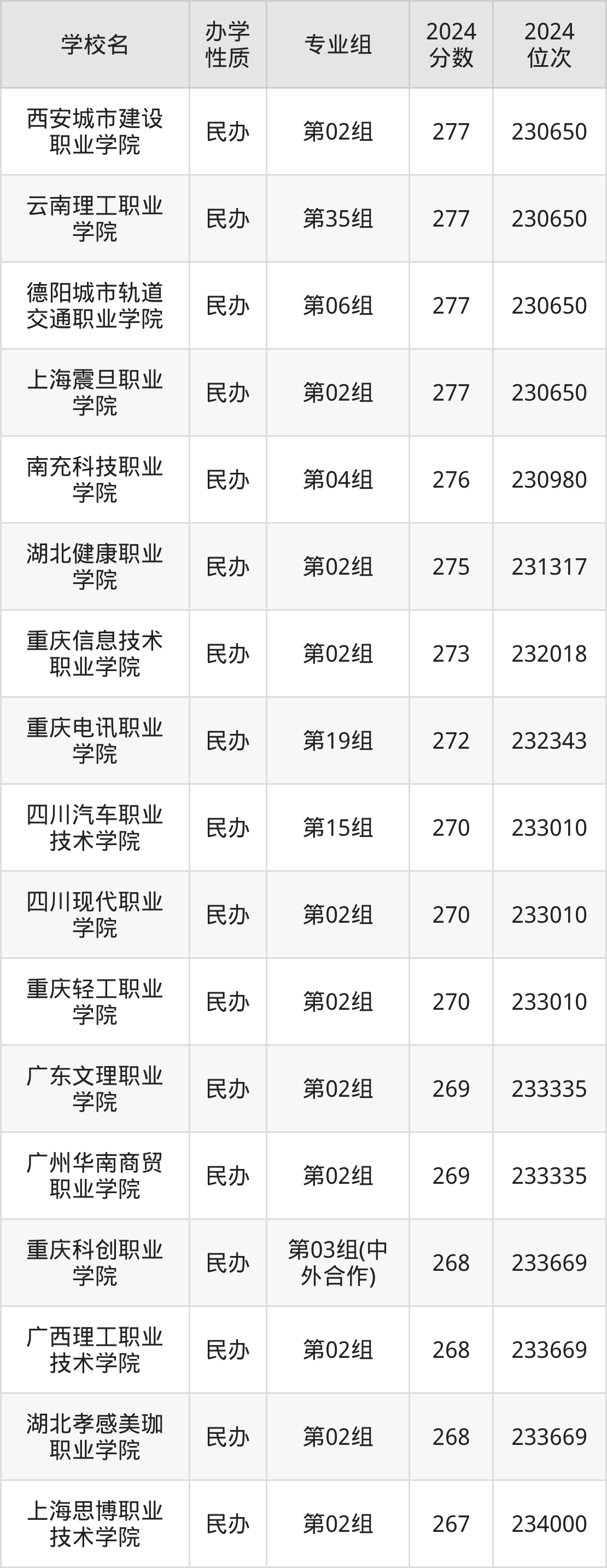 | 四川现代职业 学院 | 第02组 | 270 | 233010 |