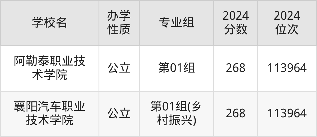 | 阿勒泰职业技 术学院 | 第01组 | 268 | 113964 |