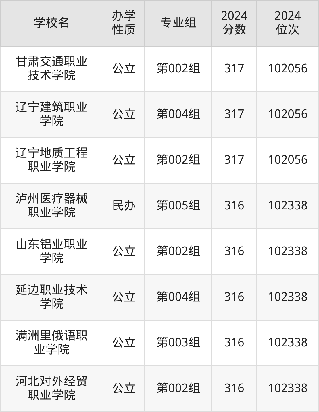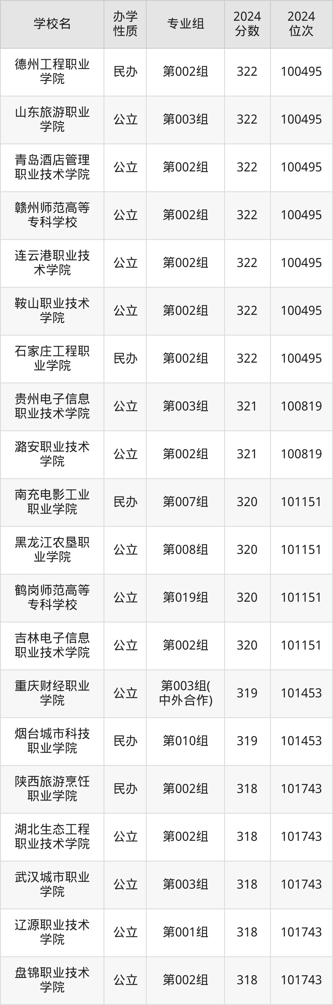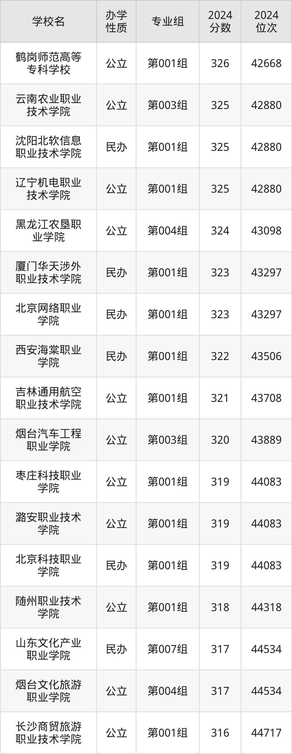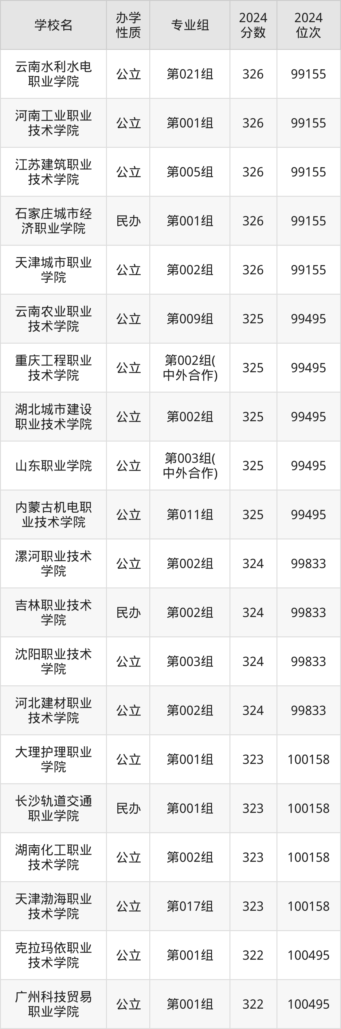 2024年黑龙江物理类321分考生能上云南水利水电职业学院、河南工业职业技术学院、江苏建筑职业技术学院、石家庄城市经济职业学院、天津城市职业学院等48所专科院校,具体录取分数线及位次为: