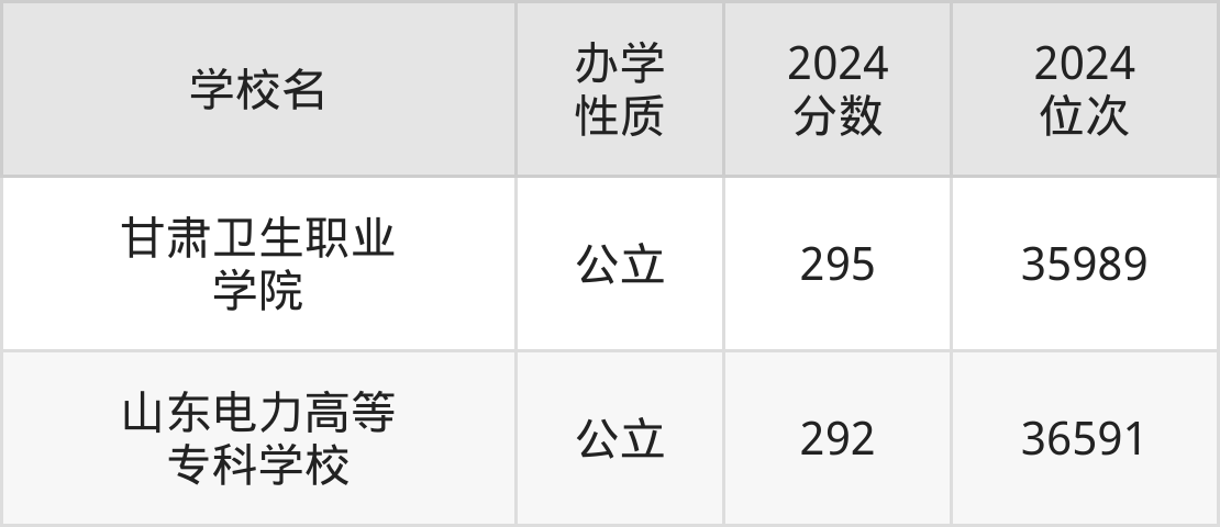 2024年新疆理科296分考生能上甘肃卫生职业学院、山东电力高等专科学校2所专科院校,具体录取分数线及位次为: