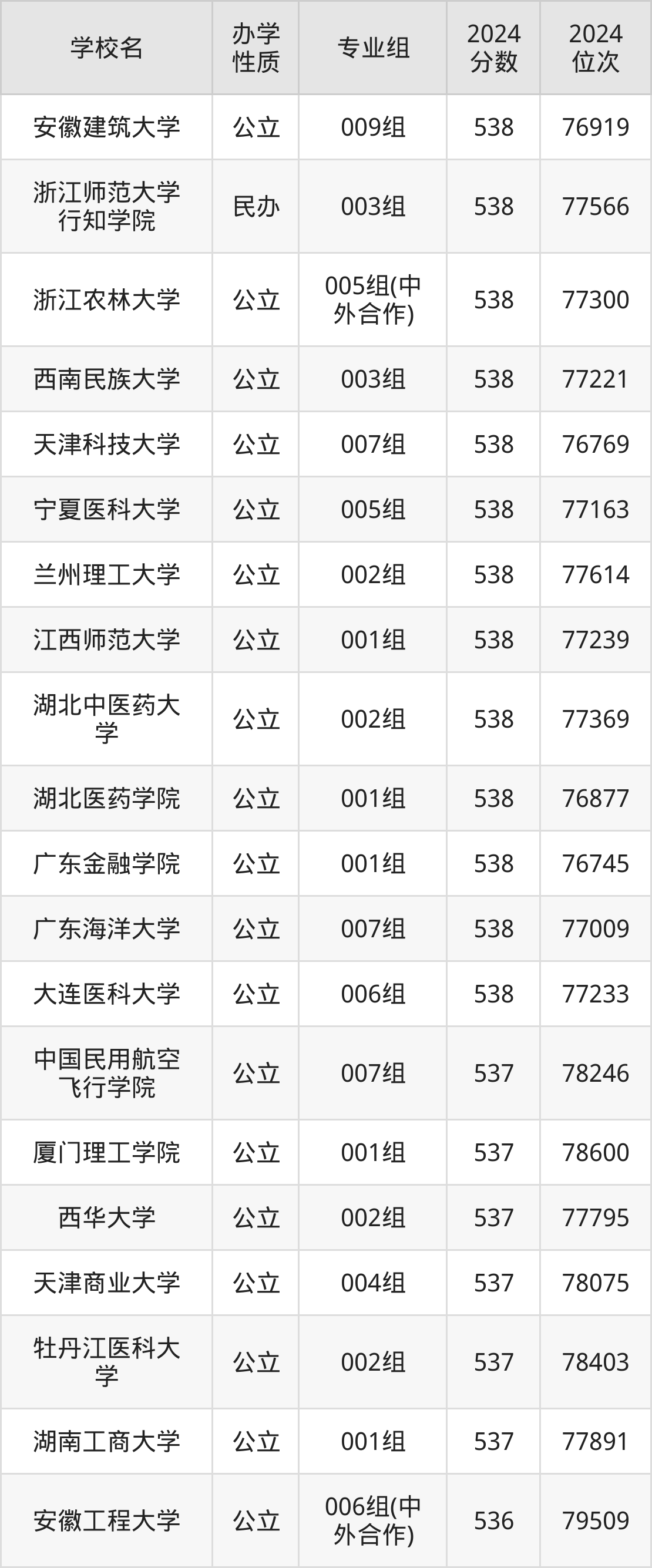 2024年安徽物理类533分考生能上安徽建筑大学、浙江师范大学行知学院、浙江农林大学、西南民族大学、天津科技大学等143所一本院校,具体录取分数线及位次为: