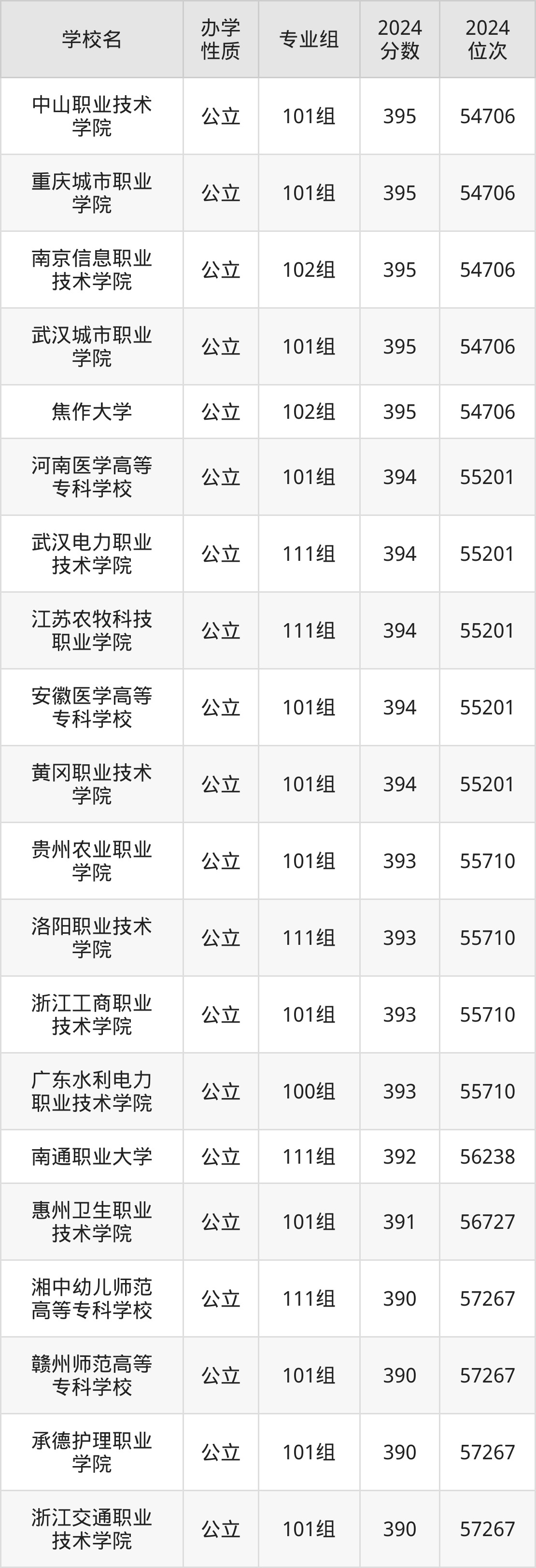 2024年广西历史类390分考生能上中山职业技术学院、重庆城市职业学院、南京信息职业技术学院、武汉城市职业学院、焦作大学等37所专科院校,具体录取分数线及位次为: