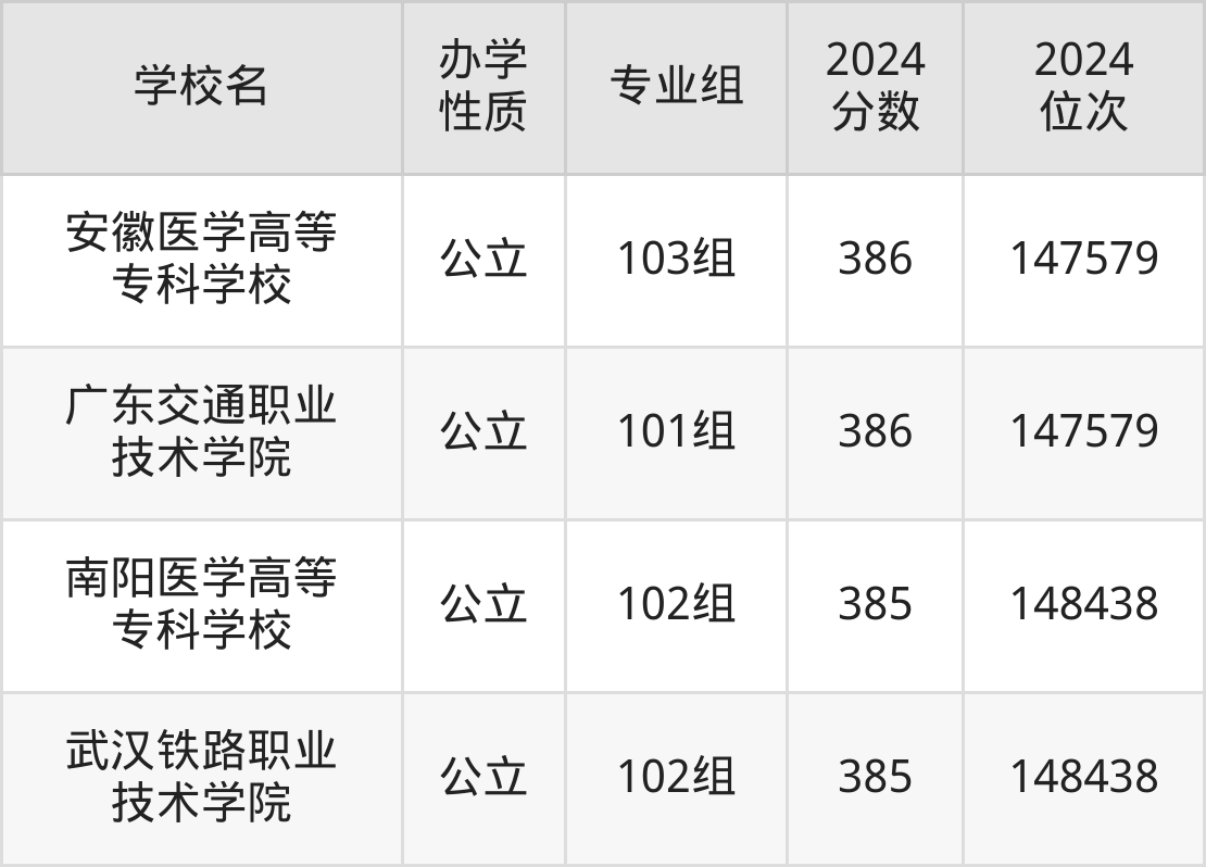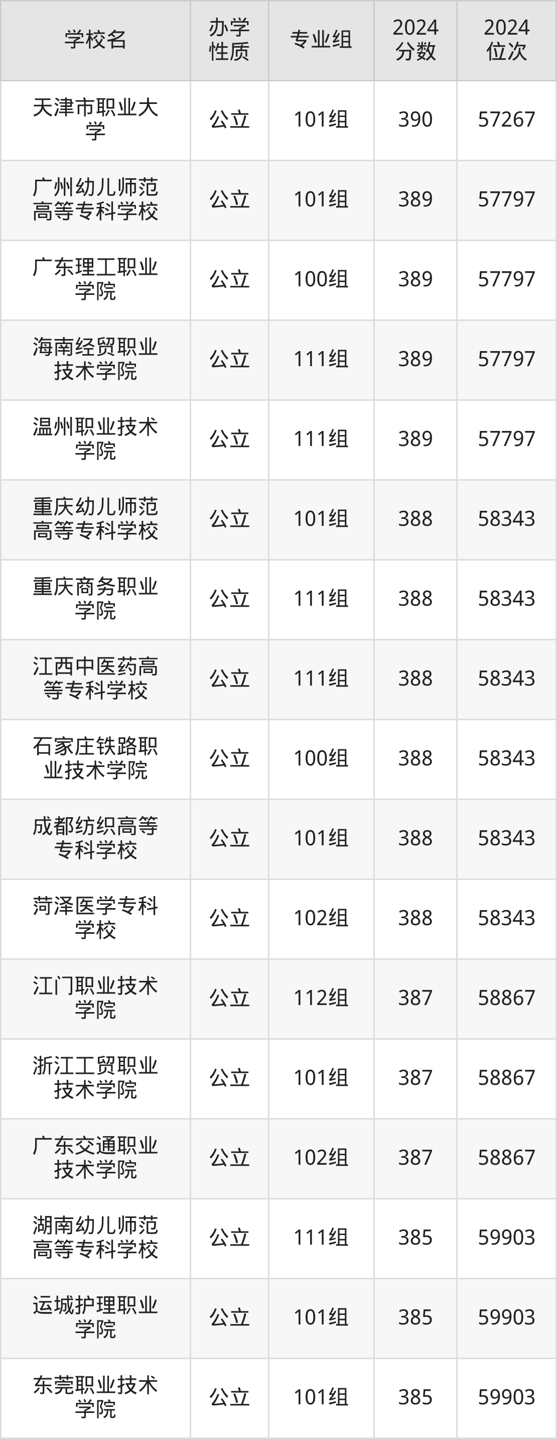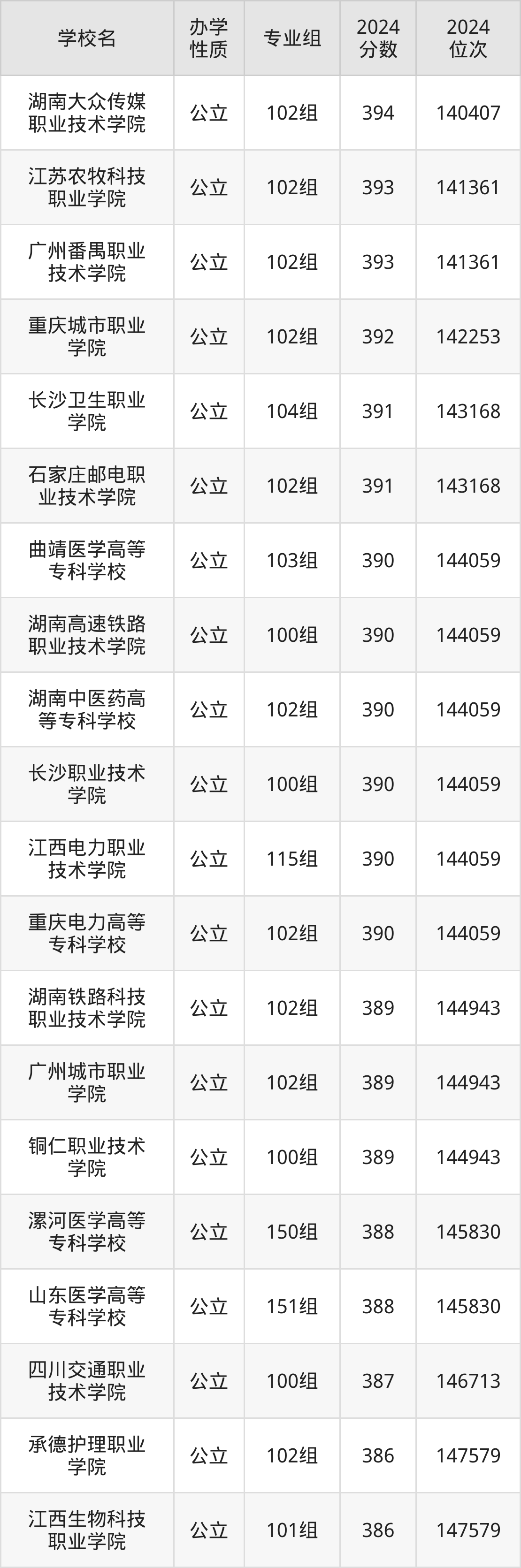 2024年广西物理类390分考生能上湖南大众传媒职业技术学院、江苏农牧科技职业学院、广州番禺职业技术学院、重庆城市职业学院、长沙卫生职业学院等24所专科院校,具体录取分数线及位次为: