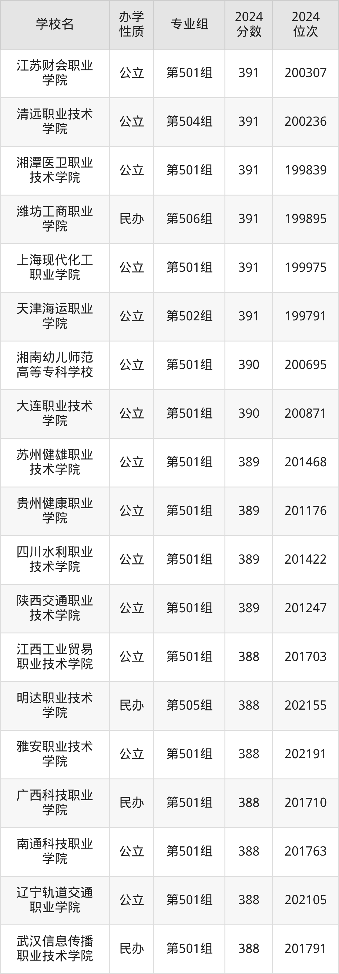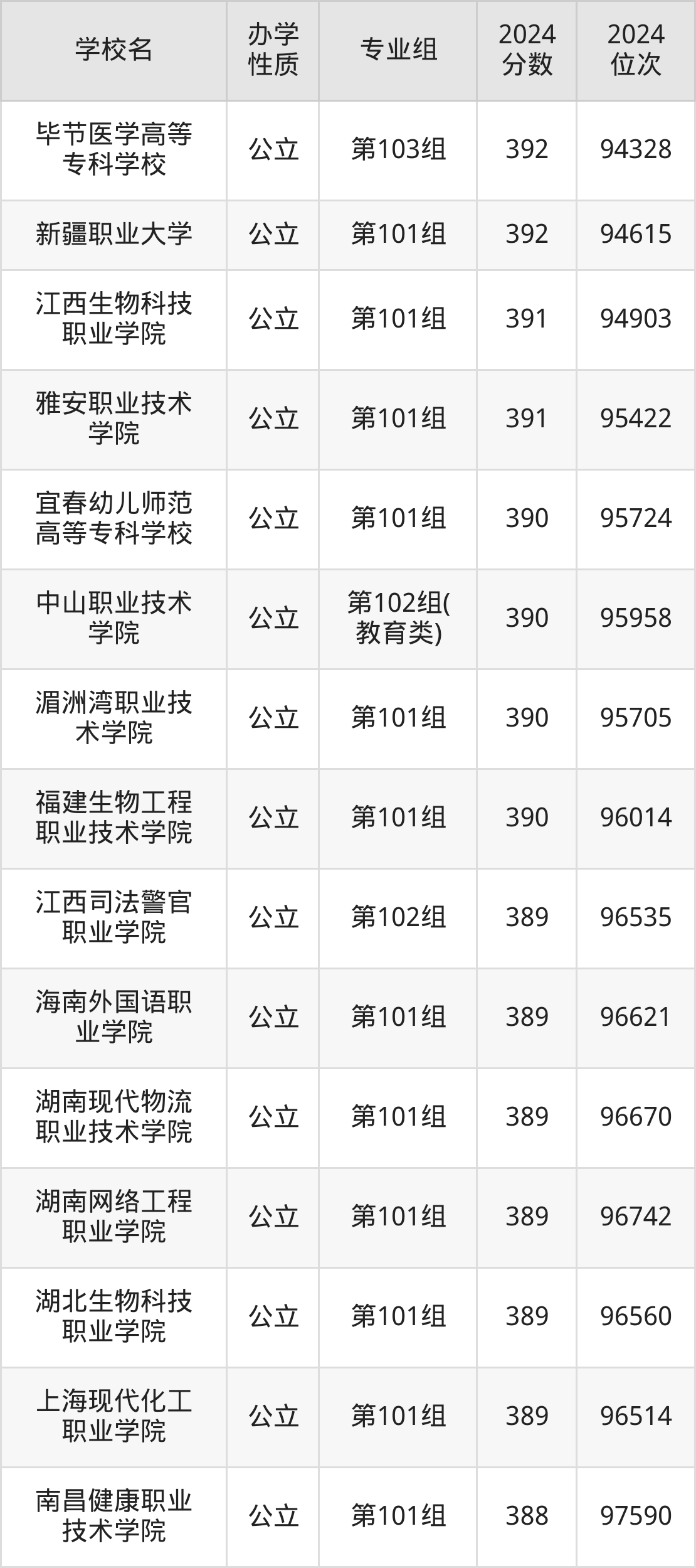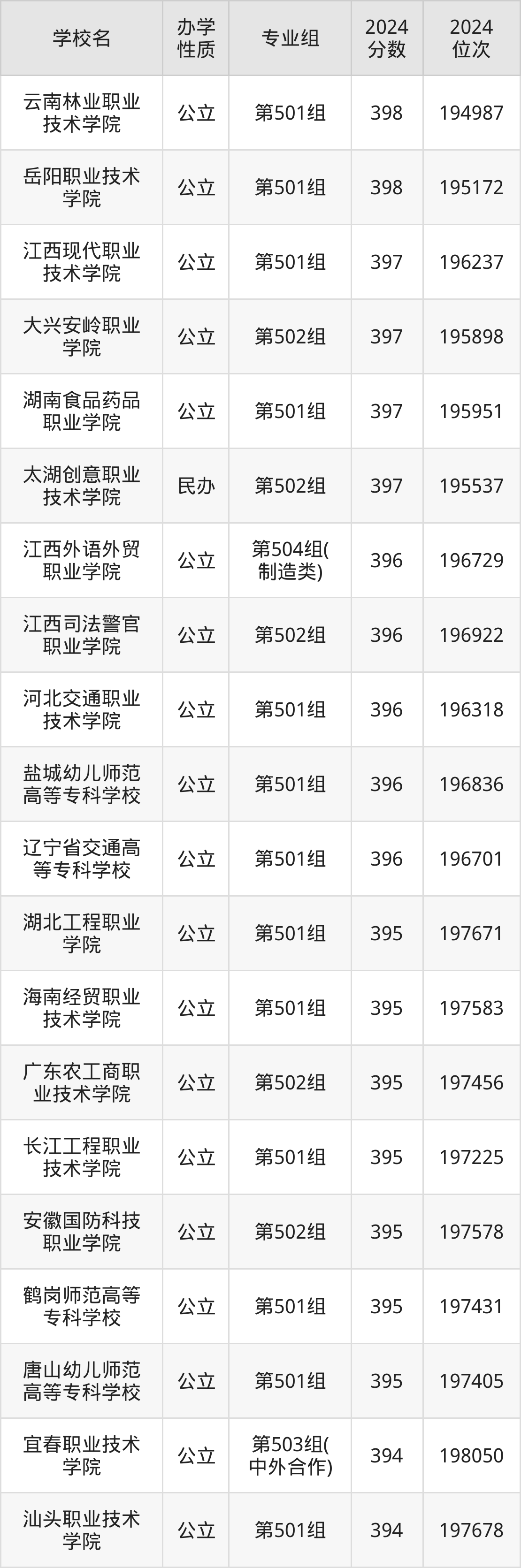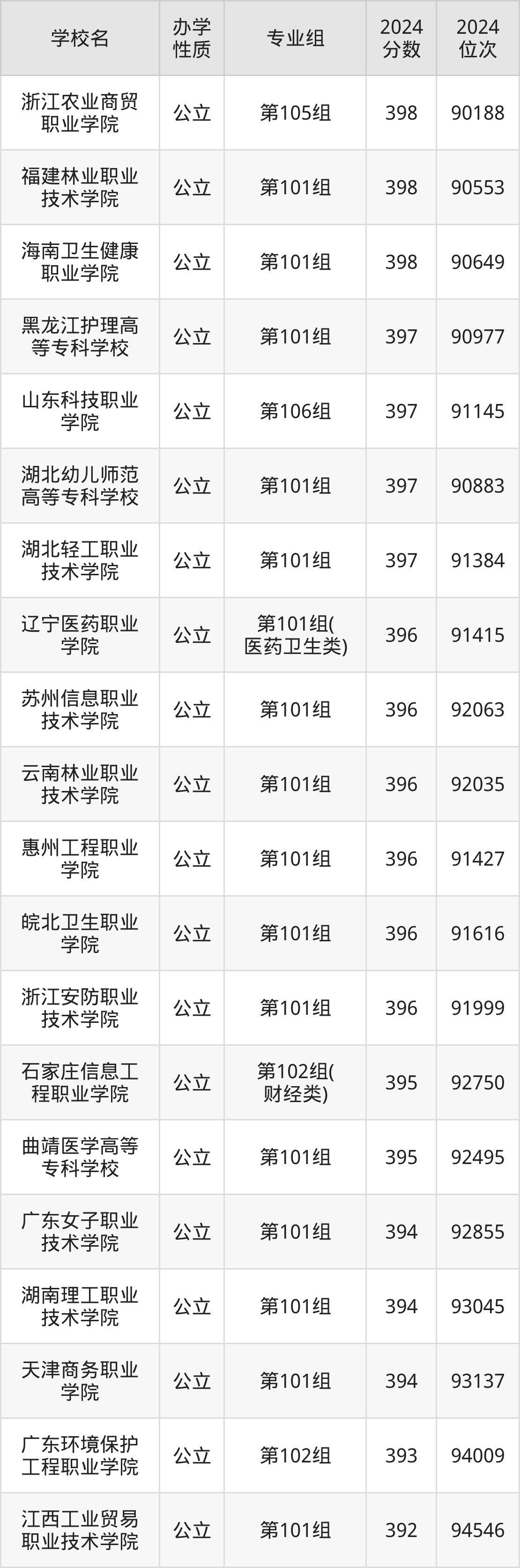 2024年江西历史类393分考生能上浙江农业商贸职业学院、福建林业职业技术学院、海南卫生健康职业学院、黑龙江护理高等专科学校、山东科技职业学院等35所专科院校,具体录取分数线及位次为: