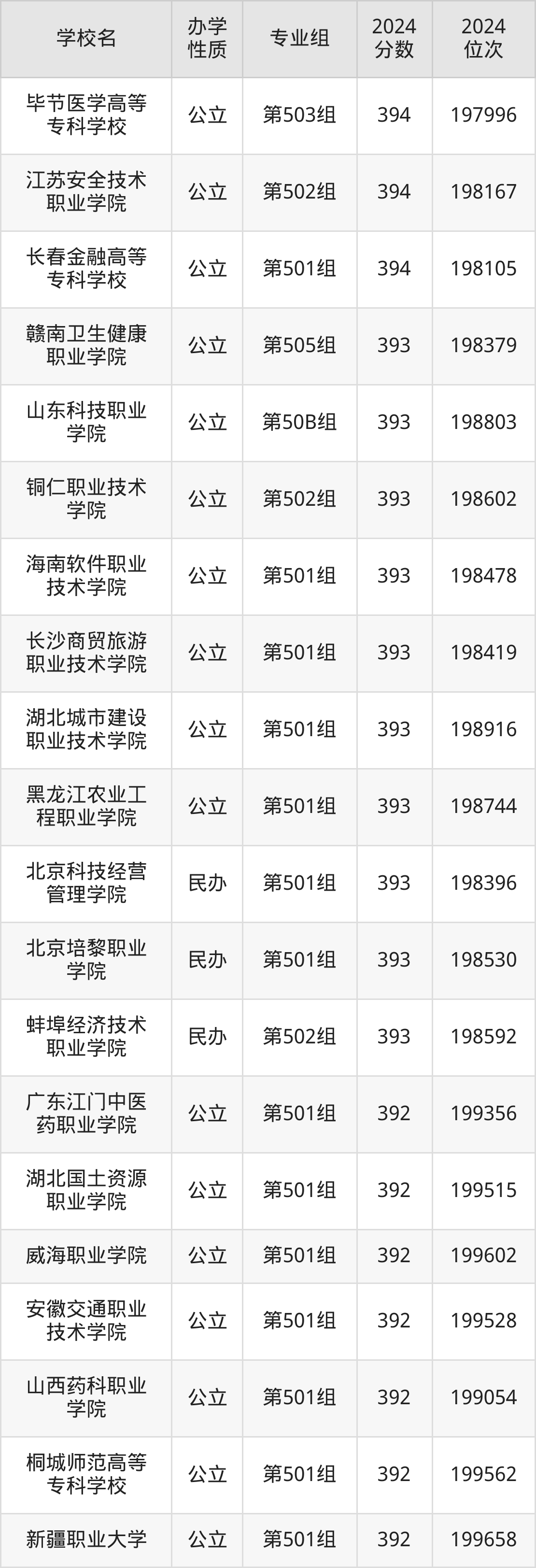 | 毕节医学高等 专科学校 | 第503组 | 394 | 197996 |