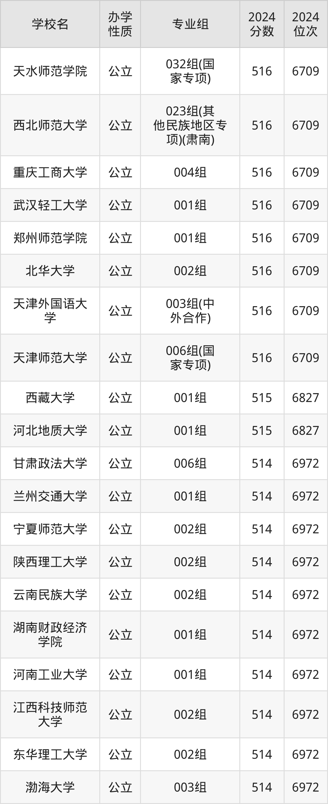 | 天水师范学院 | 032组(国 家专项) | 516 | 6709 |
