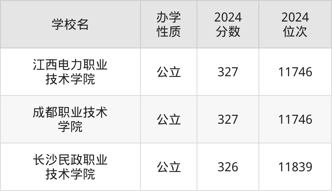 2024年新疆文科329分考生能上江西电力职业技术学院、成都职业技术学院、长沙民政职业技术学院3所专科院校,具体录取分数线及位次为: