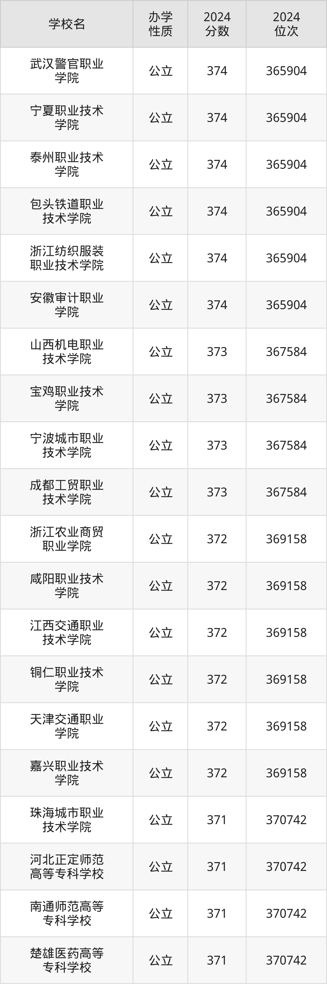 | 宁夏职业技术 学院 | 374 | 365904 |