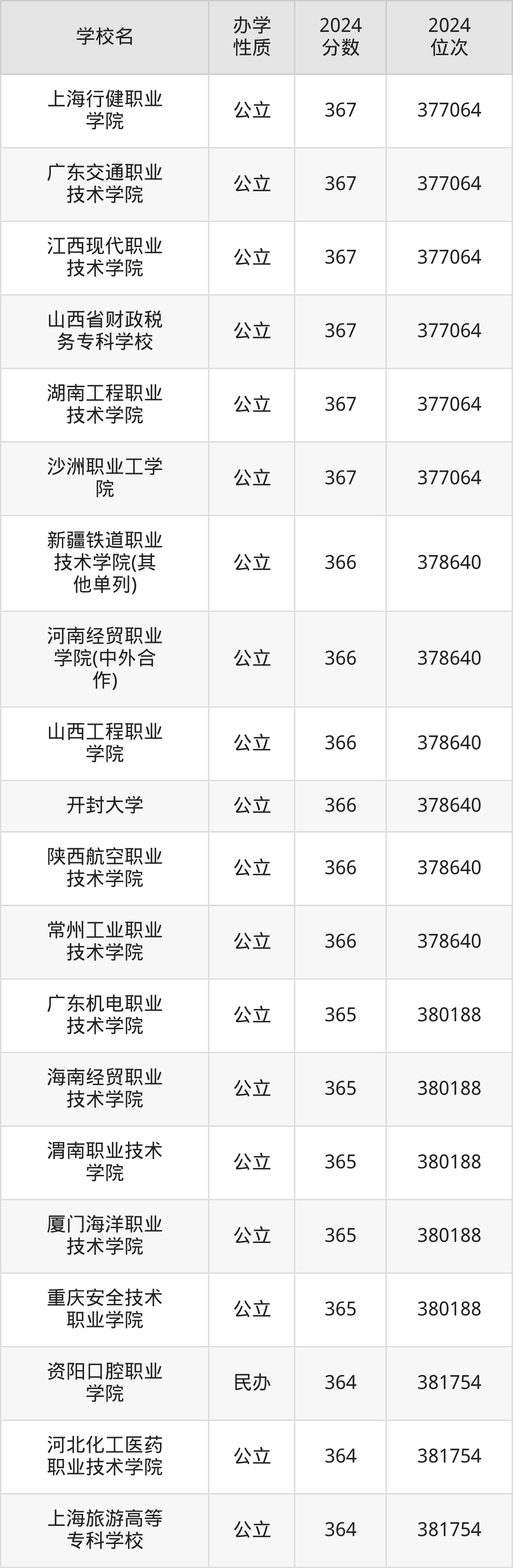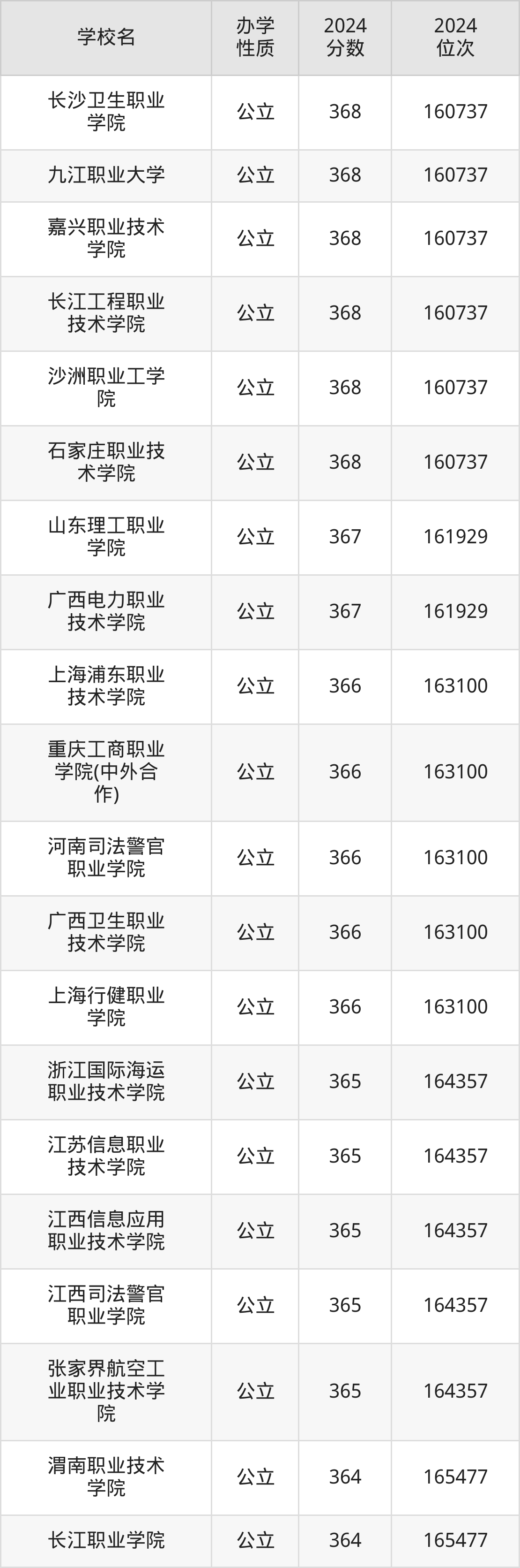 | 长沙卫生职业 学院 | 368 | 160737 |