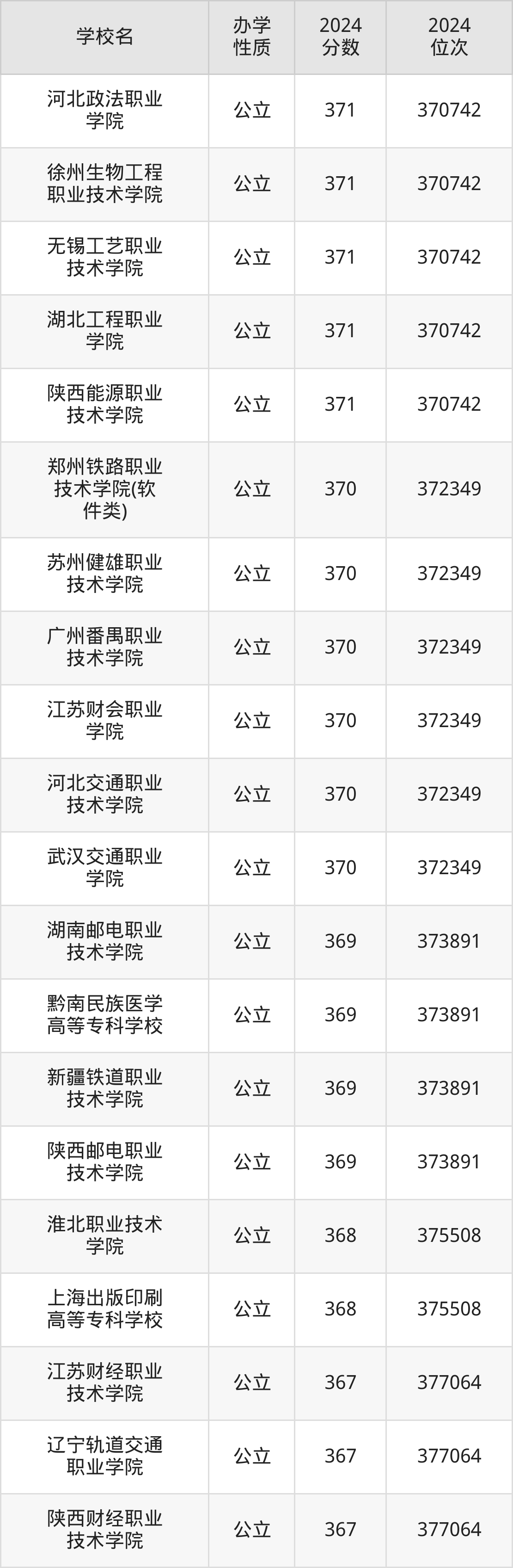 | 河北交通职业 技术学院 | 370 | 372349 |