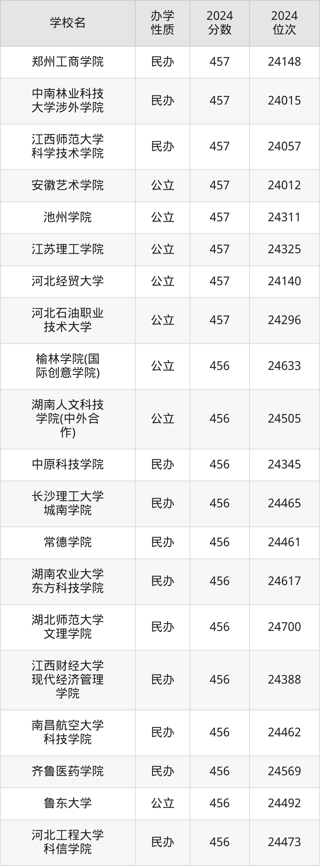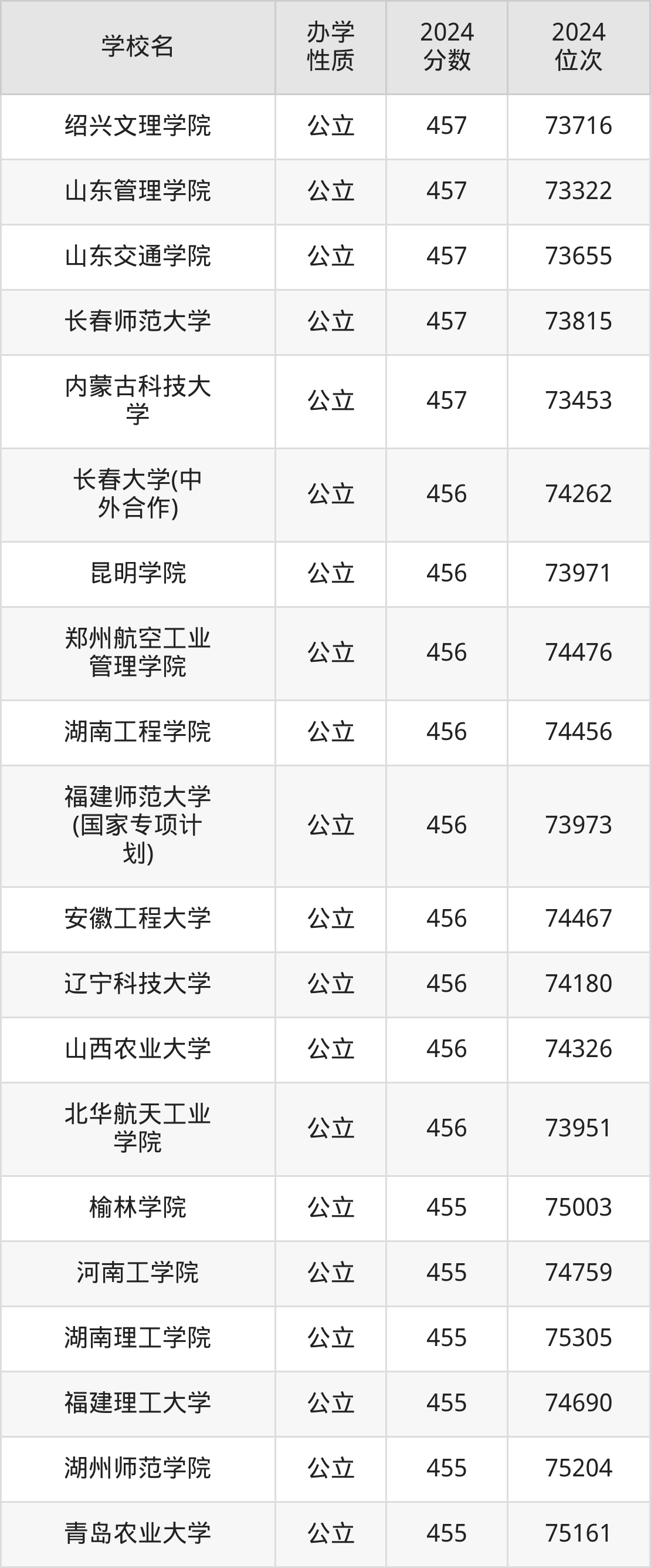 | 长春大学(中 外合作) | 456 | 74262 |