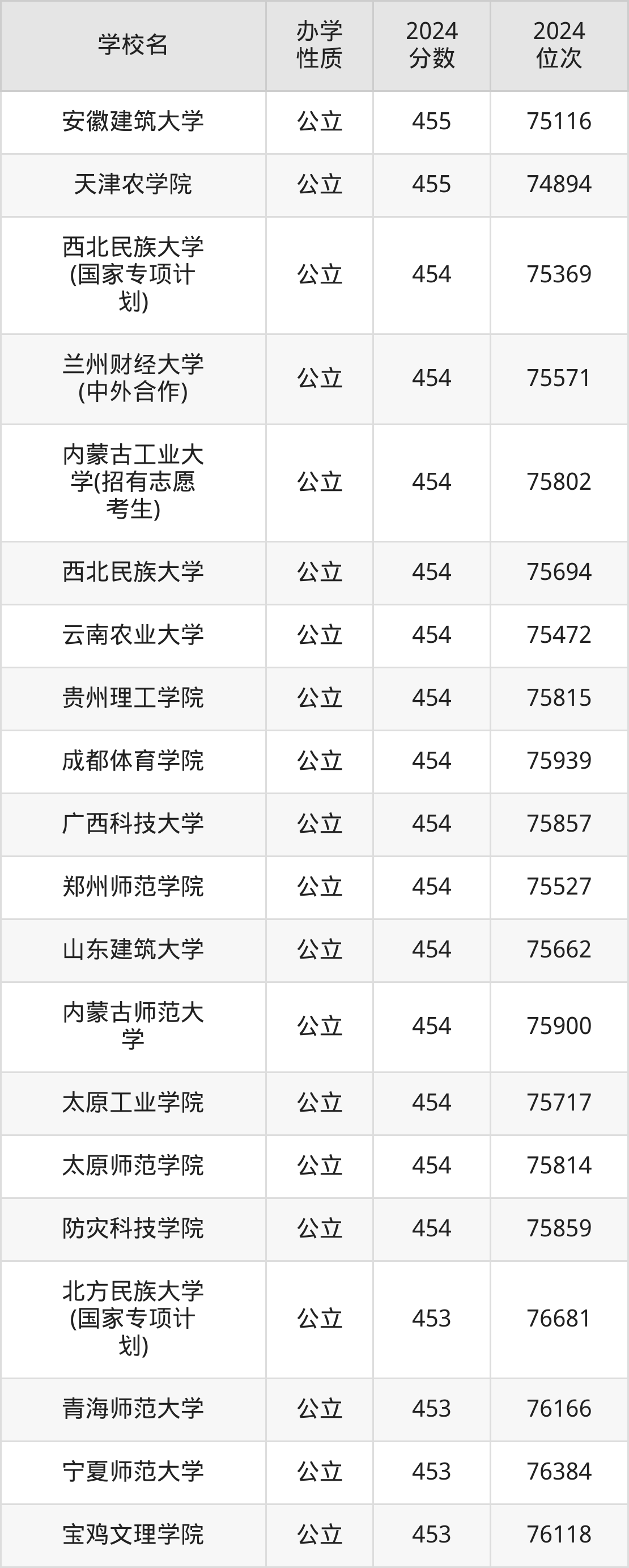 | 西北民族大学 (国家专项计 划) | 454 | 75369 |