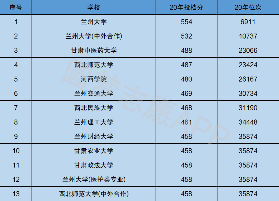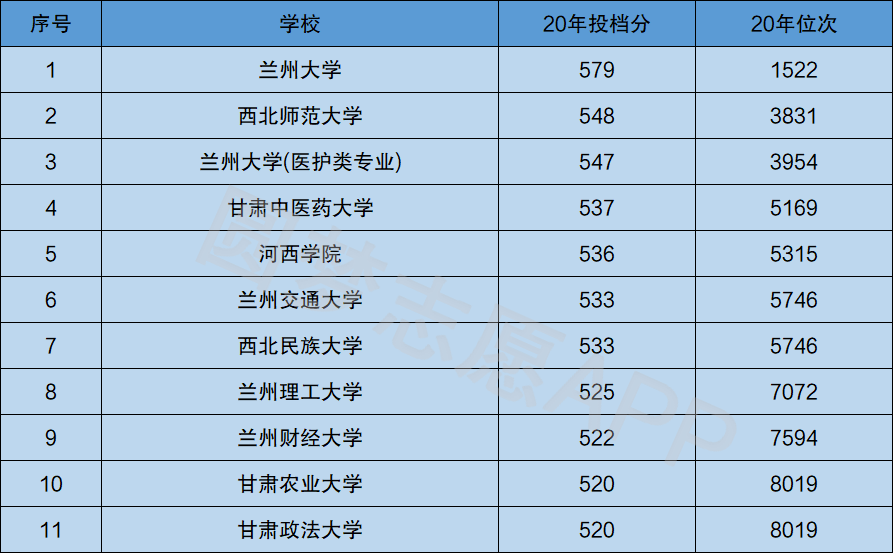 2.甘肃省一本院校2020年录取分数线排名(在甘肃)