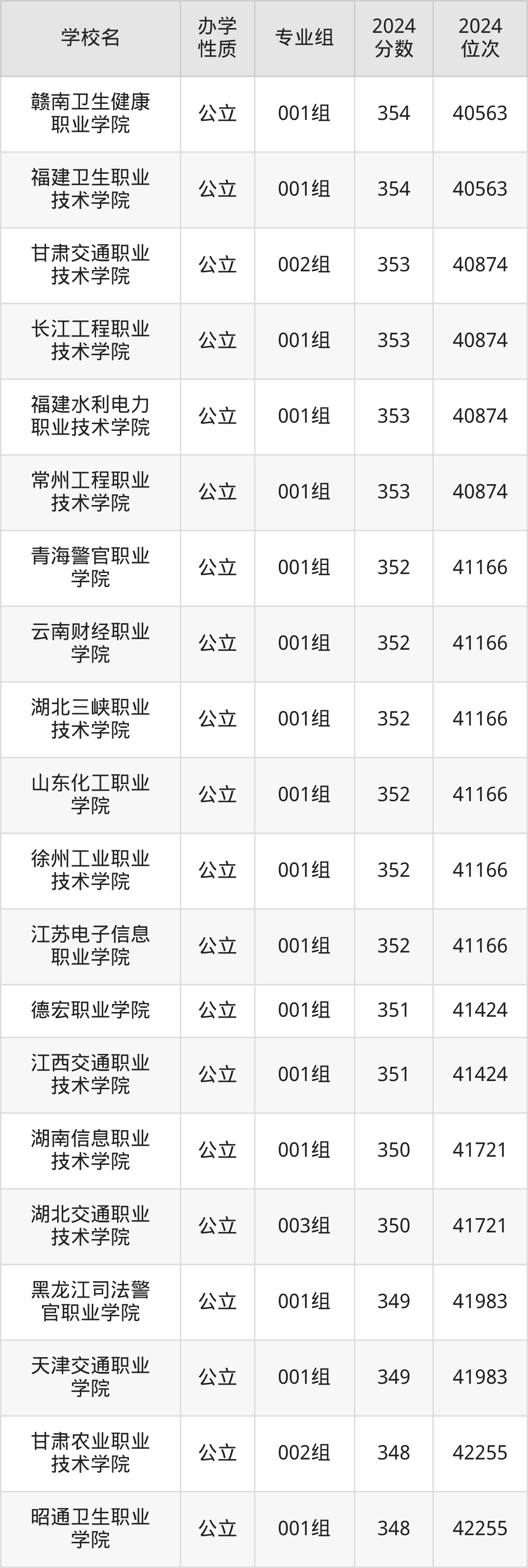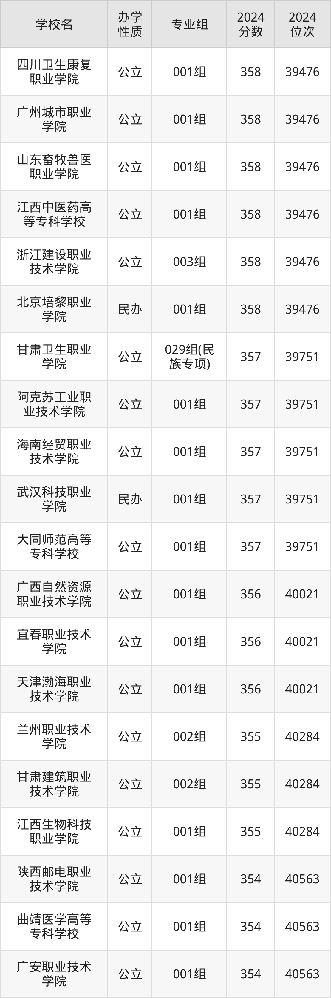 2024年甘肃历史类353分考生能上四川卫生康复职业学院、广州城市职业学院、山东畜牧兽医职业学院、江西中医药高等专科学校、浙江建设职业技术学院等43所专科院校,具体录取分数线及位次为: