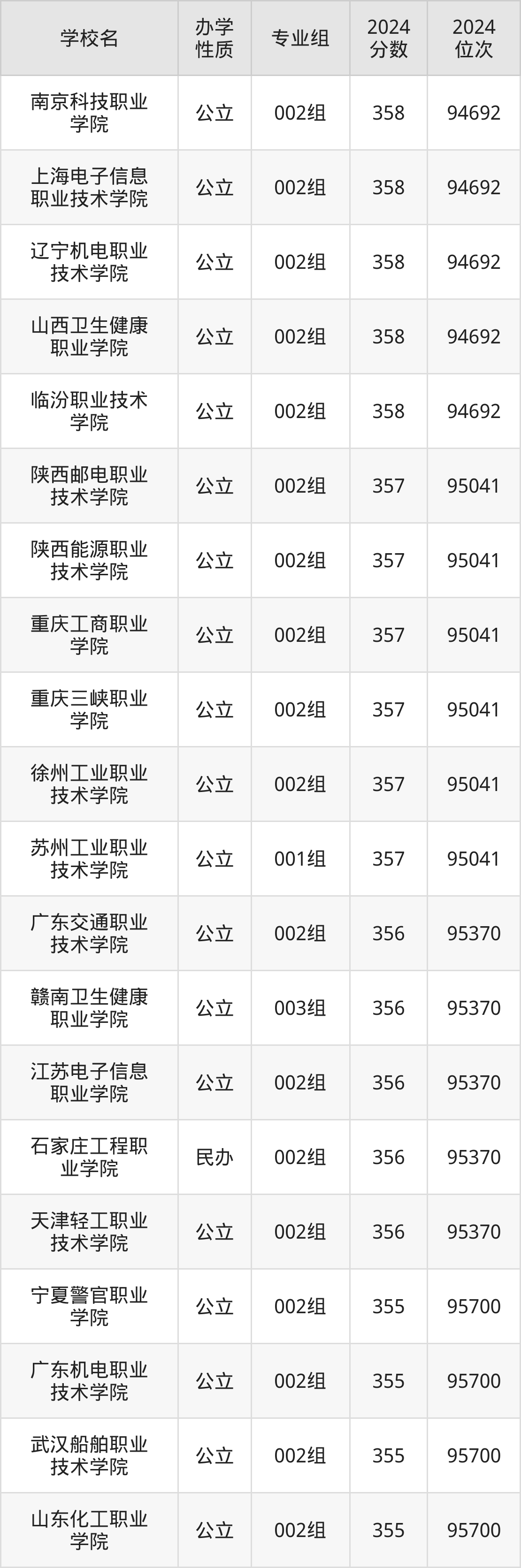 2024年甘肃物理类353分考生能上南京科技职业学院、上海电子信息职业技术学院、辽宁机电职业技术学院、山西卫生健康职业学院、临汾职业技术学院等66所专科院校,具体录取分数线及位次为:
