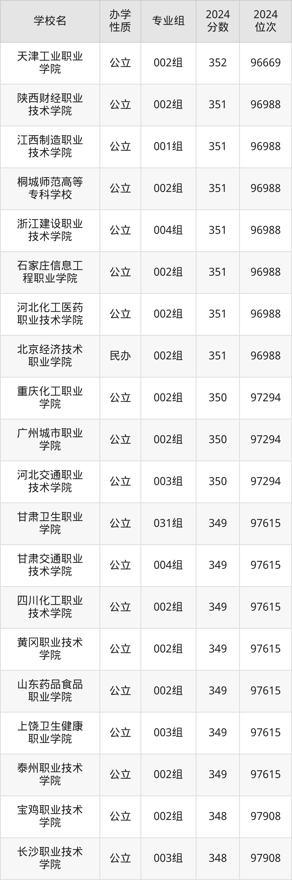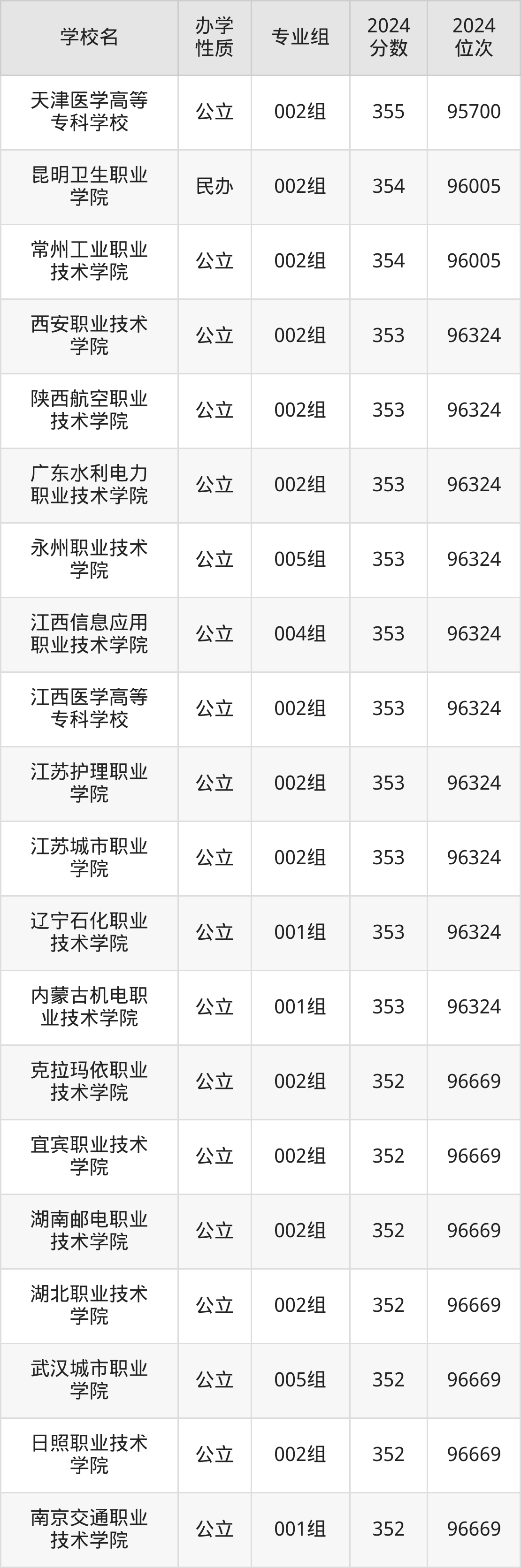 | 天津医学高等 专科学校 | 001组 | 352 | 96669 |