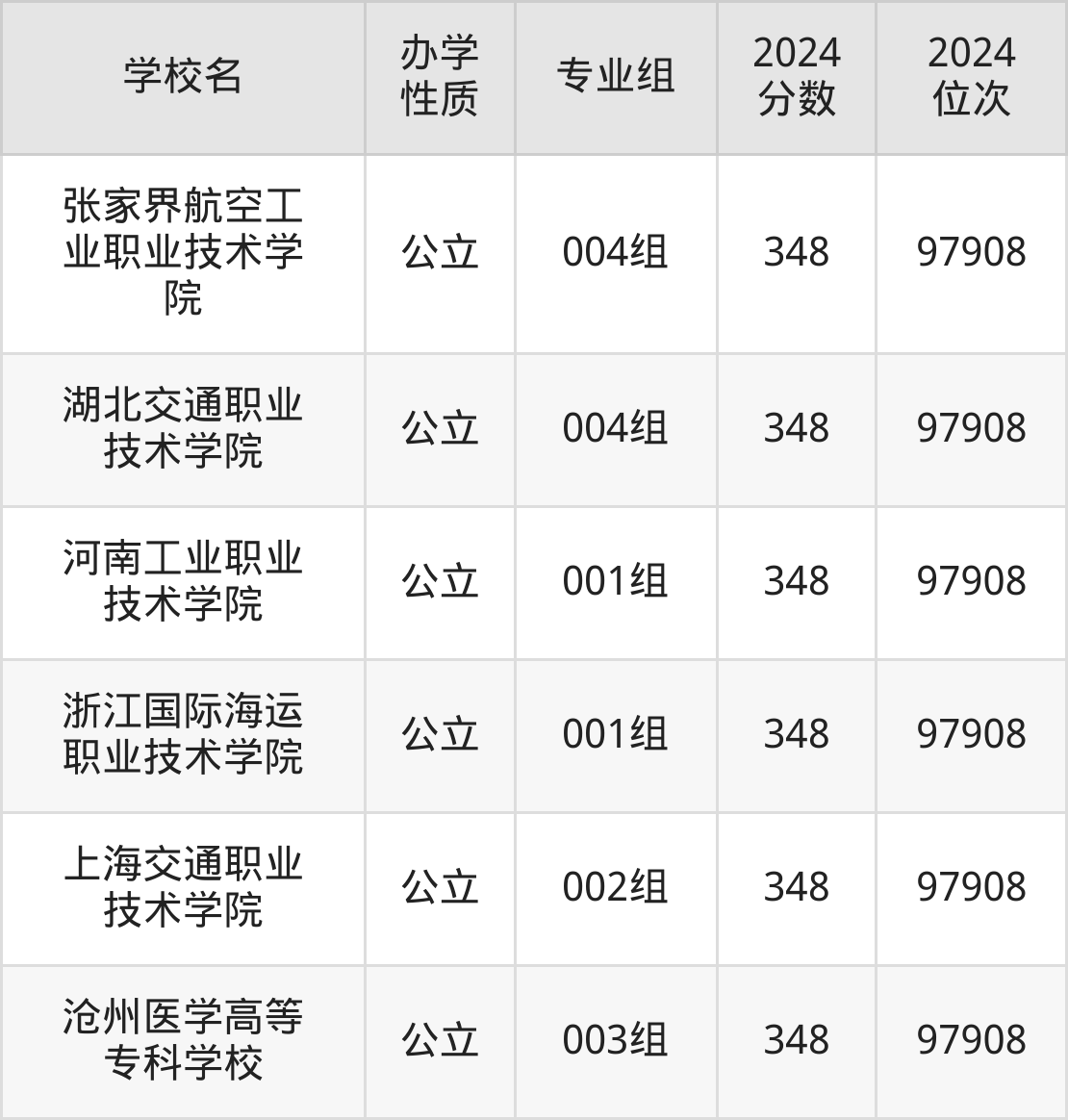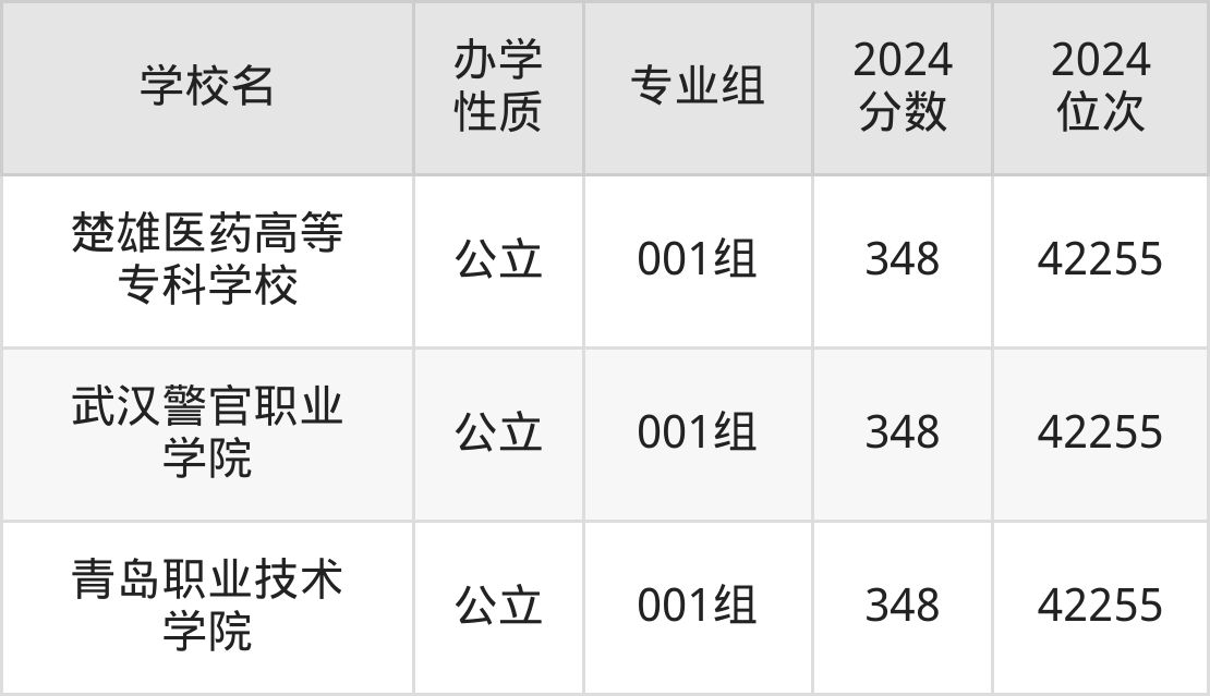 | 楚雄医药高等 专科学校 | 001组 | 348 | 42255 |