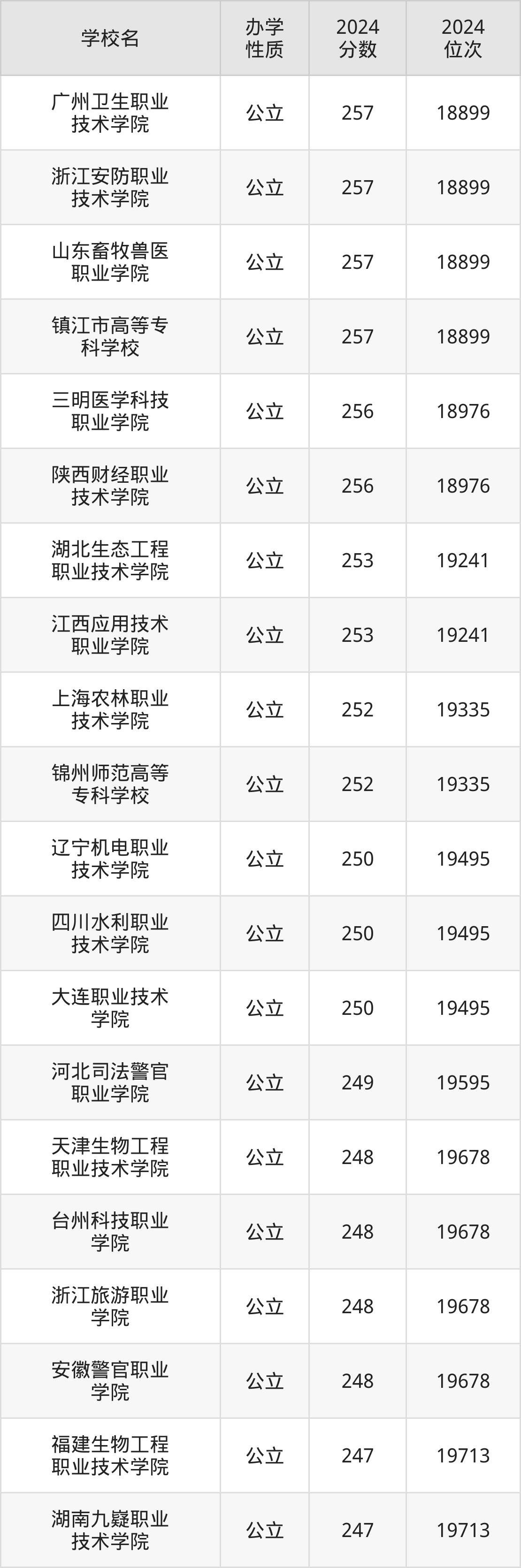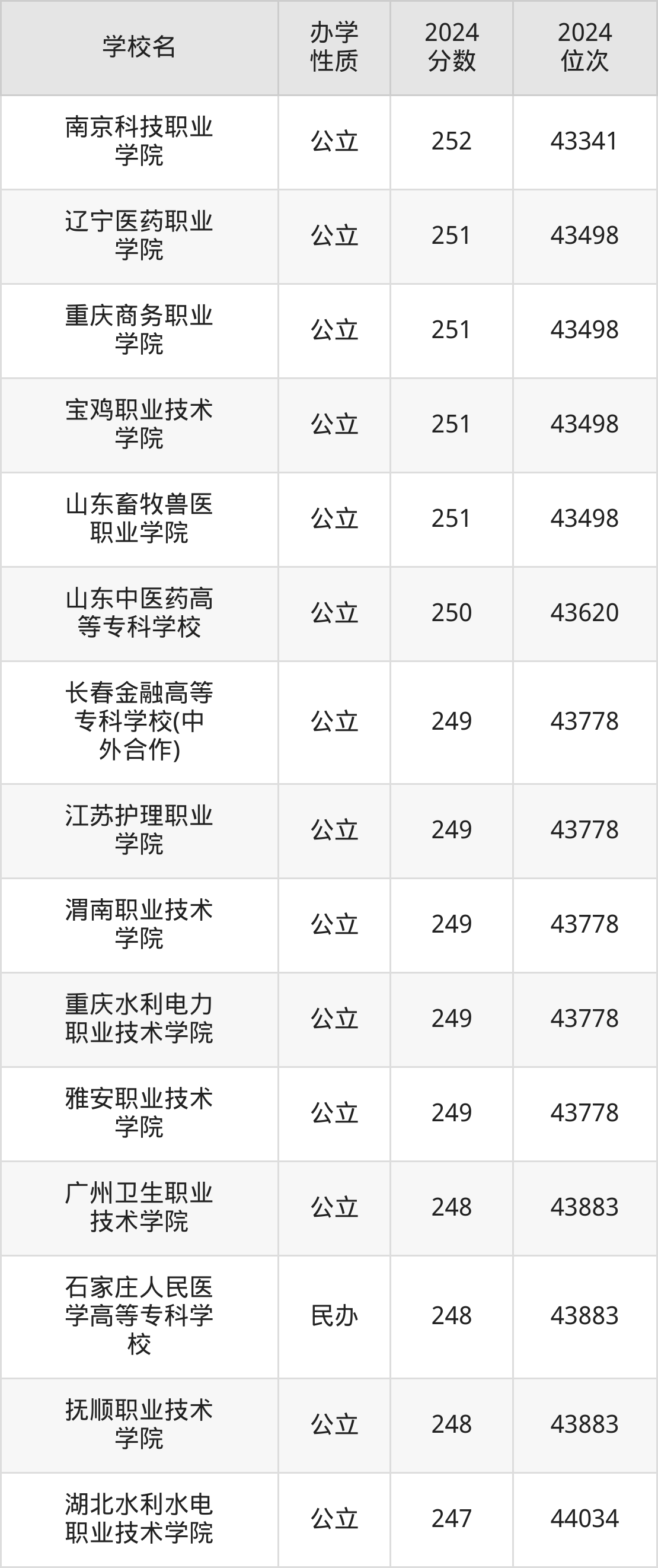 | 山东畜牧兽医 职业学院 | 251 | 43498 |