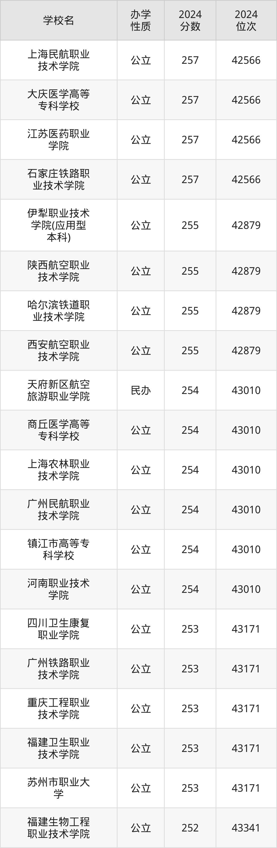 | 西安航空职业 技术学院 | 255 | 42879 |