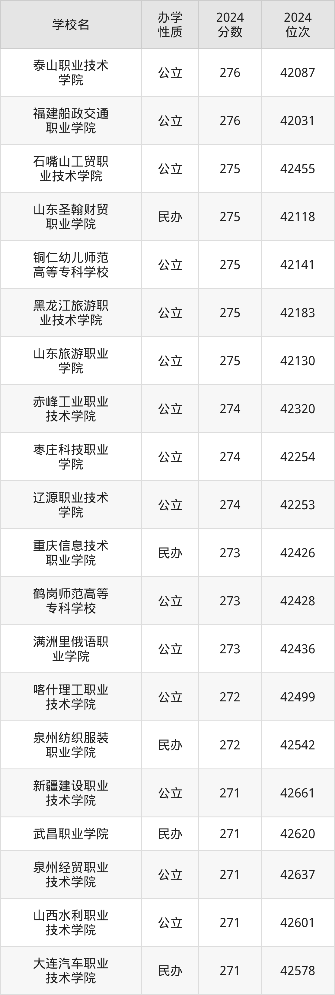 2024年宁夏理科271分考生能上泰山职业技术学院、福建船政交通职业学院、石嘴山工贸职业技术学院、山东圣翰财贸职业学院、铜仁幼儿师范高等专科学校等29所专科院校,具体录取分数线及位次为: