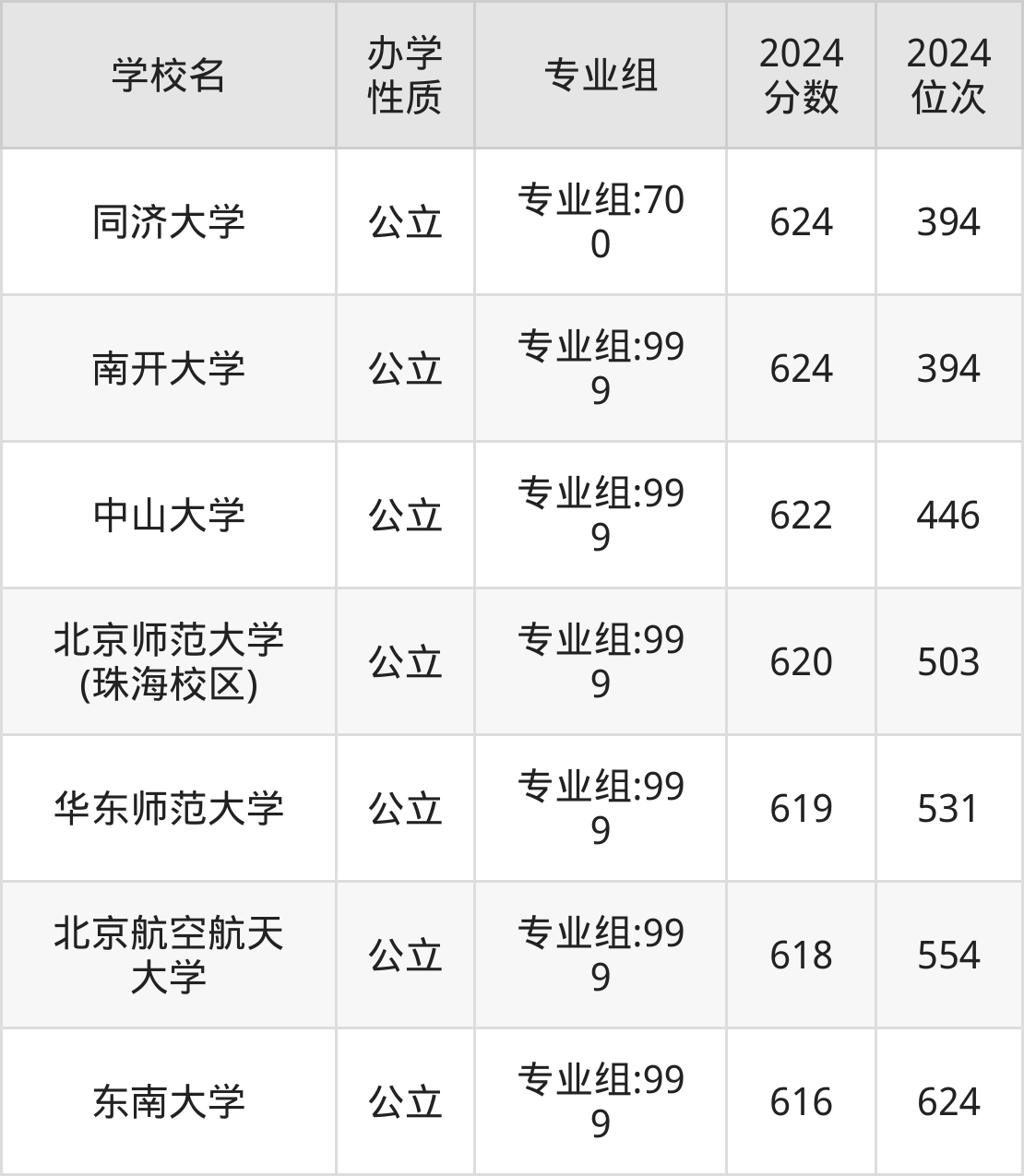 | 同济大学 | 专业组:70 0 | 624 | 394 |